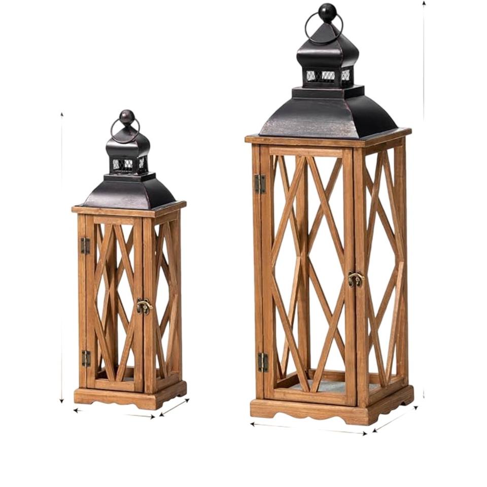 Top Quality Wooden Candle Lanterns Decorative Set Of 2 Vintage Distressed Wood & Metal Top Hurricane Lanterns For Indoor Outdoor