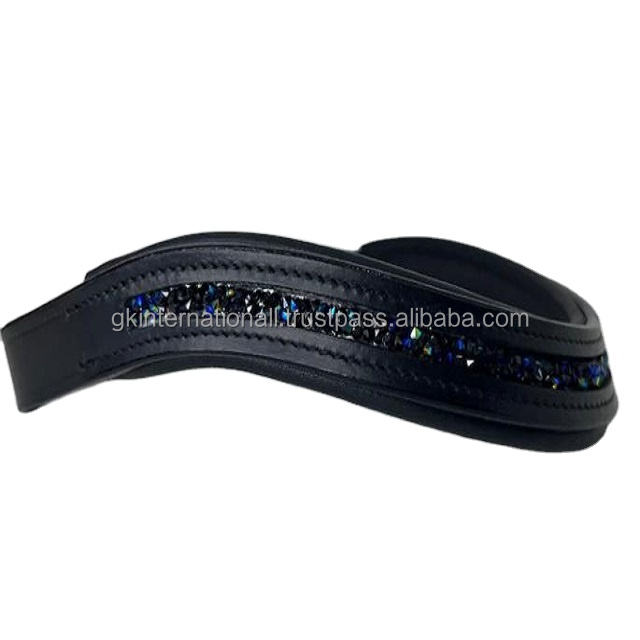 Top Quality Handmade Black Padded Leather Horse Brow Band Customized with Black Multicolor Crystals Chain Dressage Brow Band