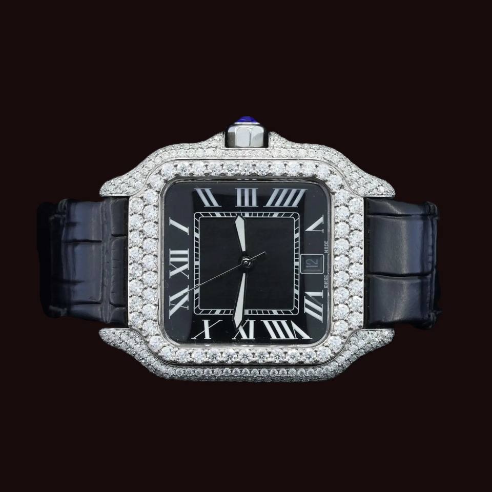 Top Rating Square Case Only Bezel Moissanite Diamond Black Leather Band Roman Numerals Fashion Man's Half Iced out Jewelry
