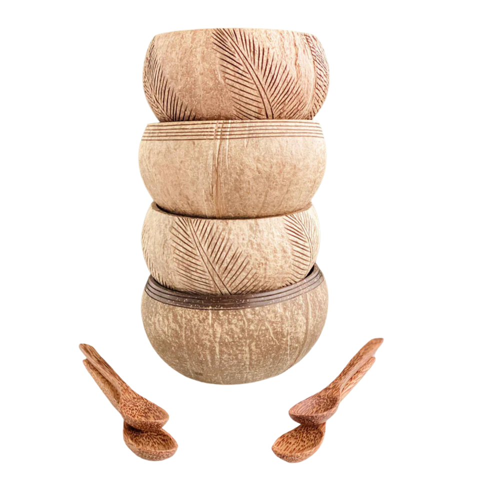 Top Sale 2024 Disposable Coconut Shell Bowls and Wooden Spoon Set High Quality Custom Logo Design Sustainable and Engraved