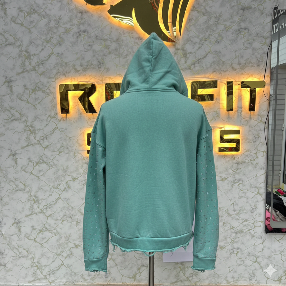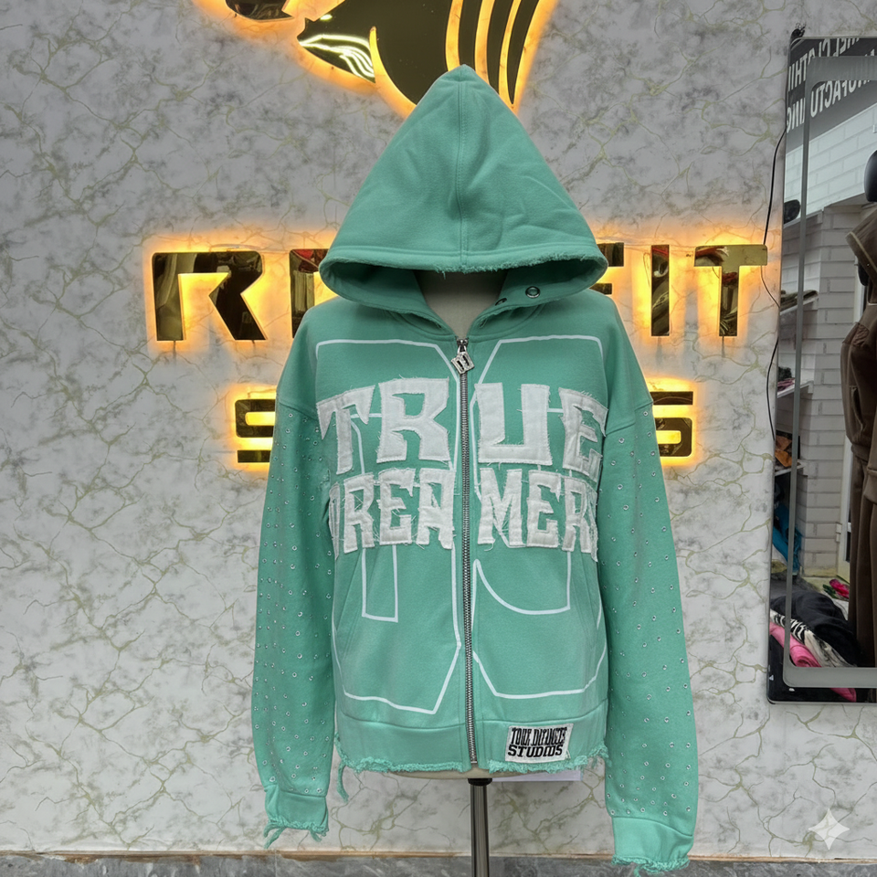 Top Sale Professional Manufacturer Teal Zipper Hoodie Rhinestone Zip up Jacket Vintage Washed Men Fleece Streetwear Hoodie
