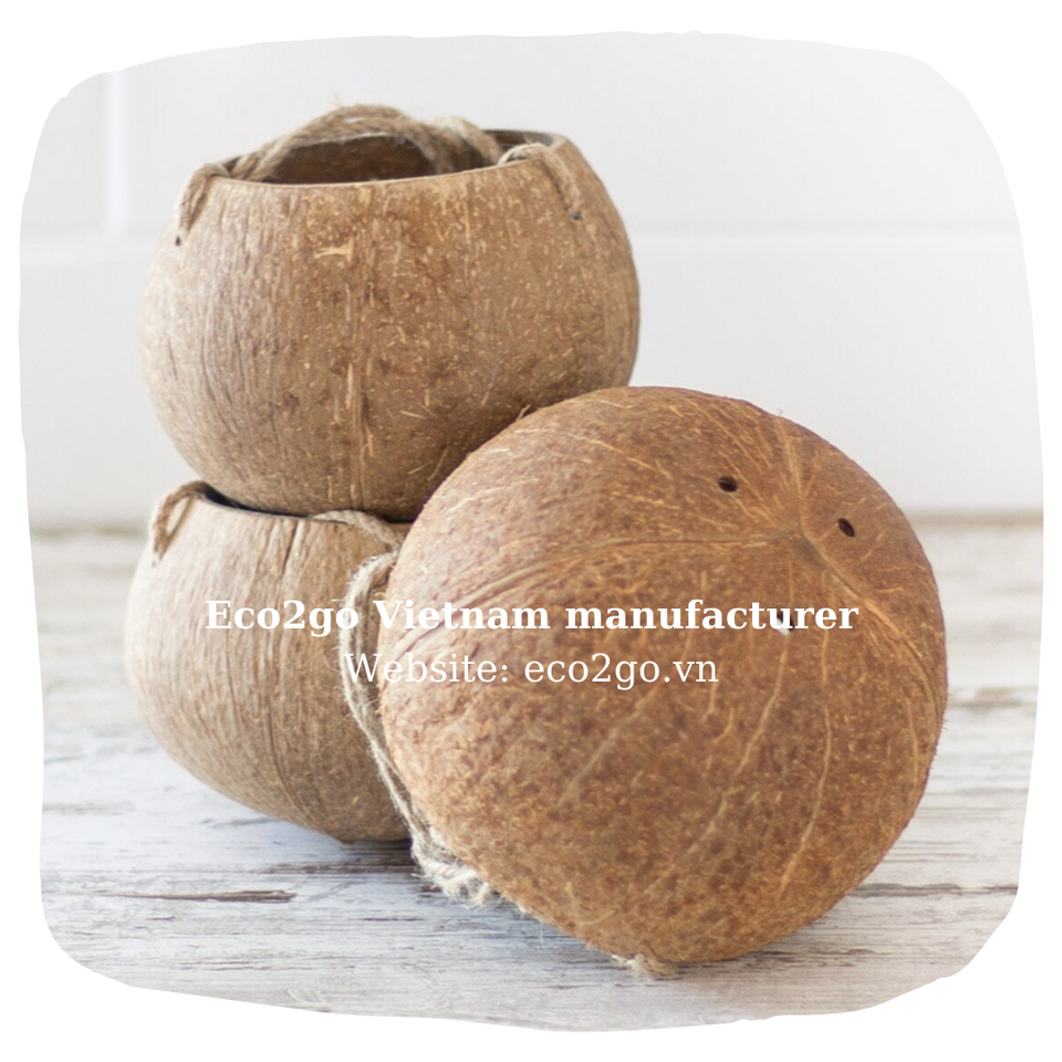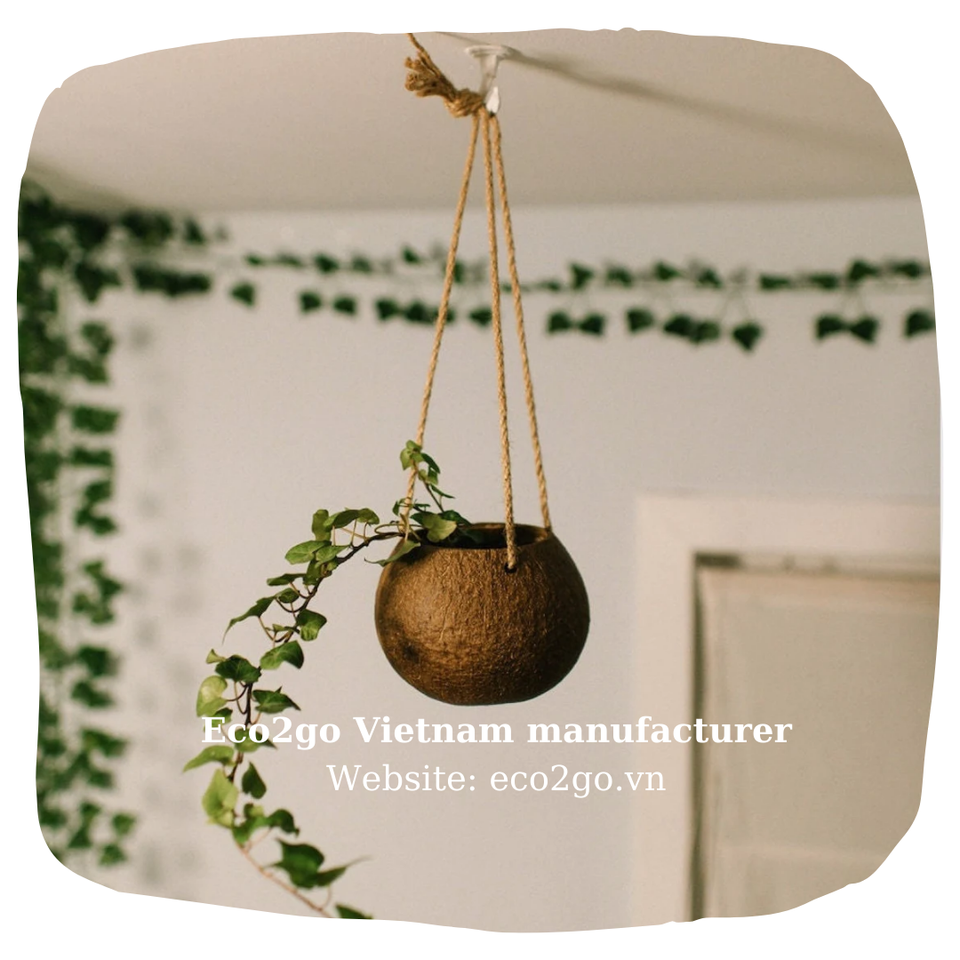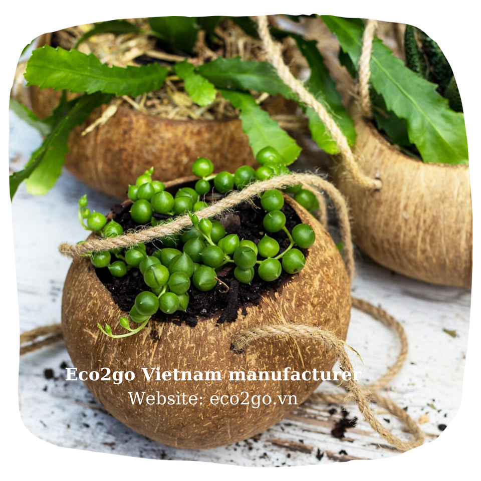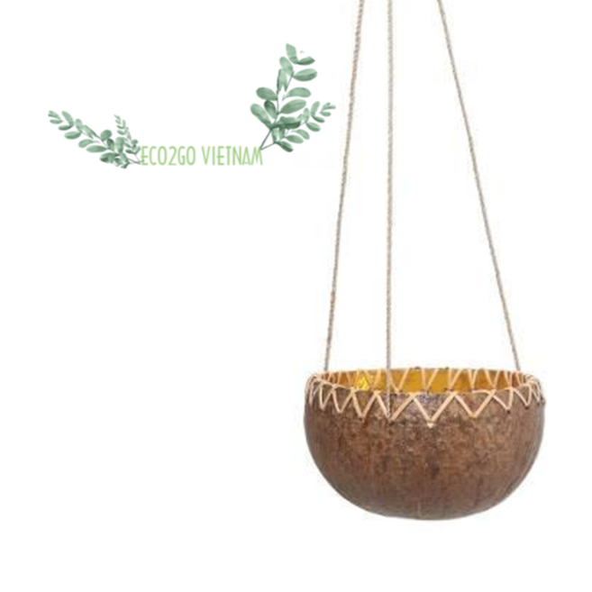 Top Seller Coconut Shell Garden Planter Pot with Hanging Rope Eco2go Laser Engraved Logo Exported to Vietnam