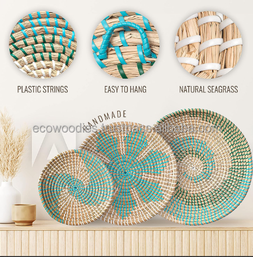 Top Seller Seagrass Hanging Woven Bamboo Wall Basket Handcrafted Rattan Hanging Wall Art Decor Latest Promotion with Rope Format