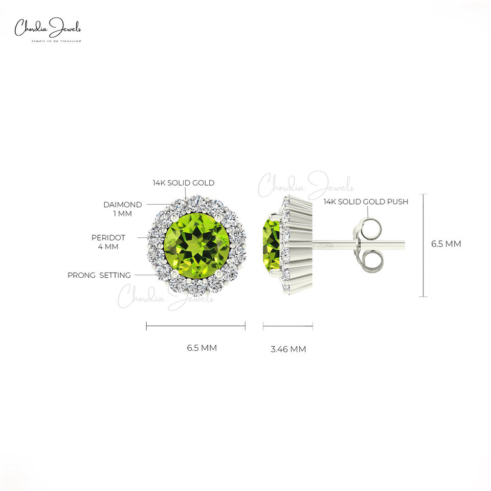 Top Selling 4mm Round Cut Natural Peridot Gemstone Studs 14k Solid Gold Diamond Halo Earrings Wholesale Fine Jewelry for Resell