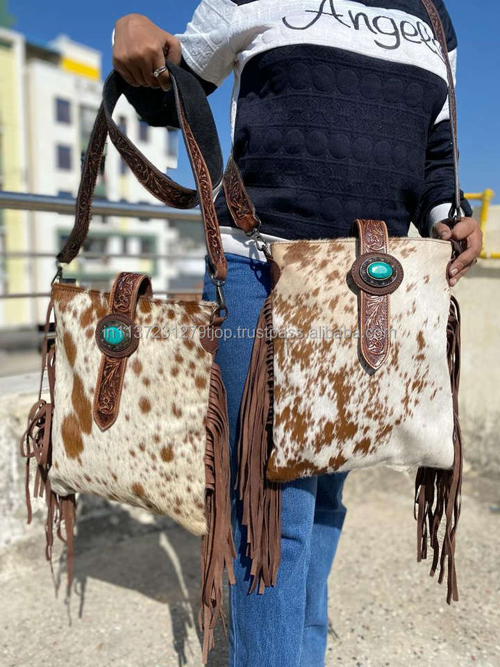 Top Selling Cowhide Leather Fringe Handbag for Women Handcrafted Tooled Carving Boho Style Cowgirl Leather Bag