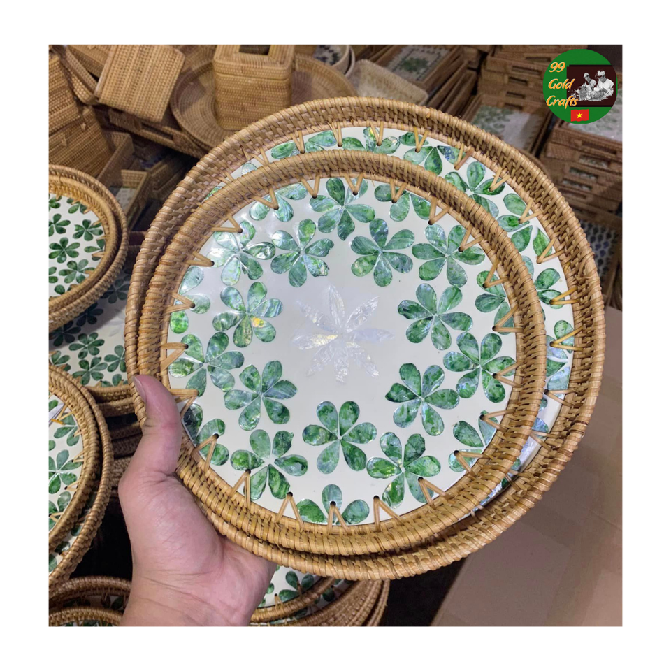 Top Selling Decorative Rattan Mosaic Serving Tray Mix Mother of Pearl Handcrafted Natural Rattan Tray Wholesale