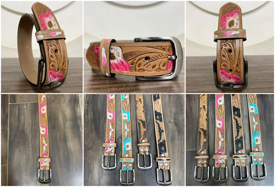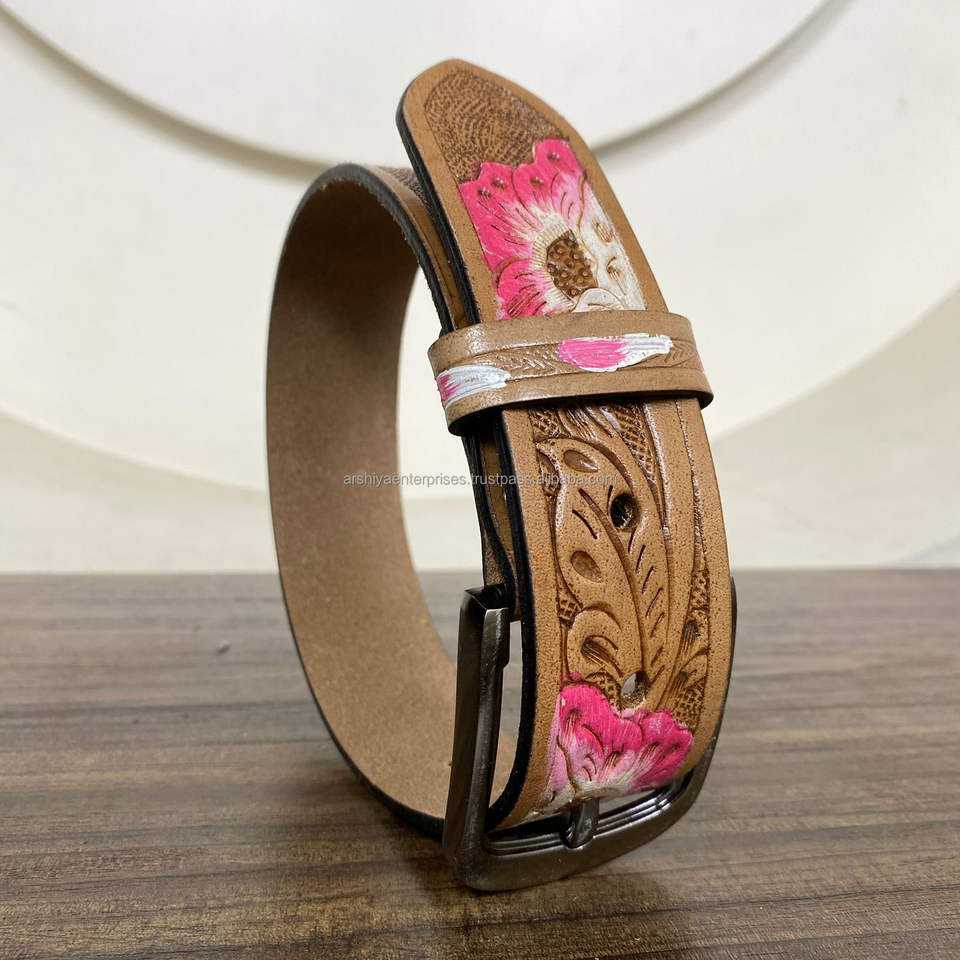 Top Selling Fashionable Kids Western Hand-Tooled Genuine Leather Belt with Pink Floral Design Durable & Stylish for Boys & Girls