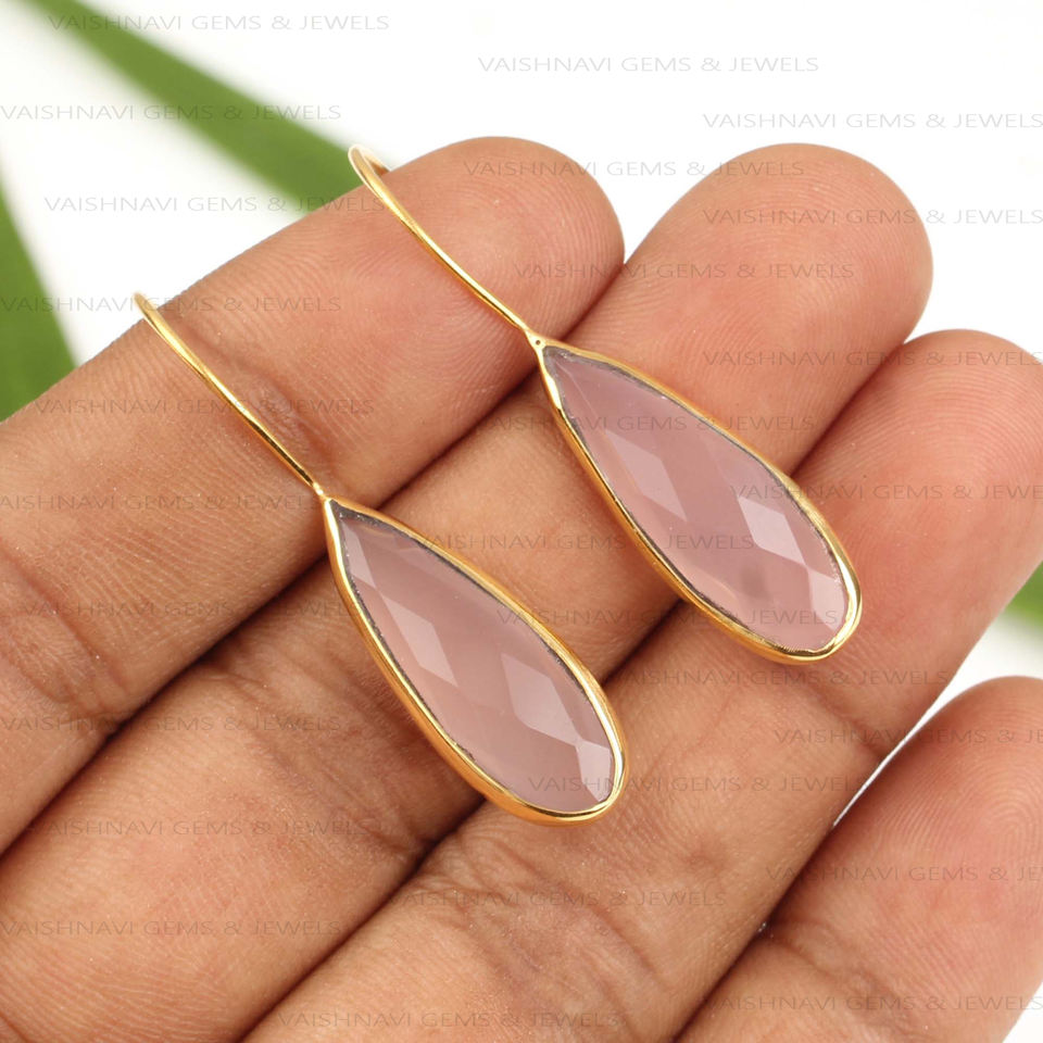 Top Selling Natural Pink Chalcedony Earring 925 Sterling Silver 18K Gold Plated Eternity Vermeil 8x24mm Pear Fine Dangle Earring