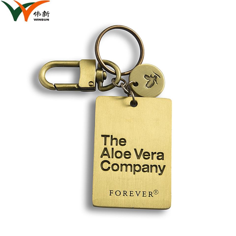 Top Selling Rectangular Charm Debossed Logo Antique Brass Metal Keychain