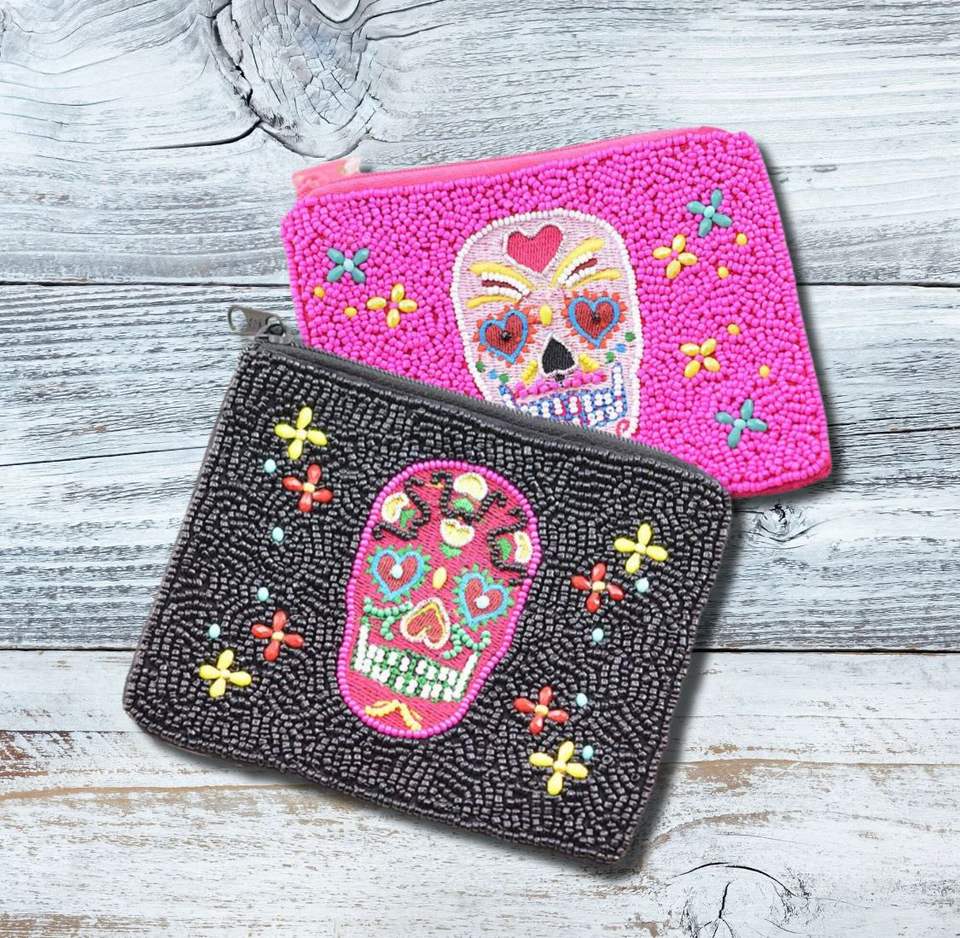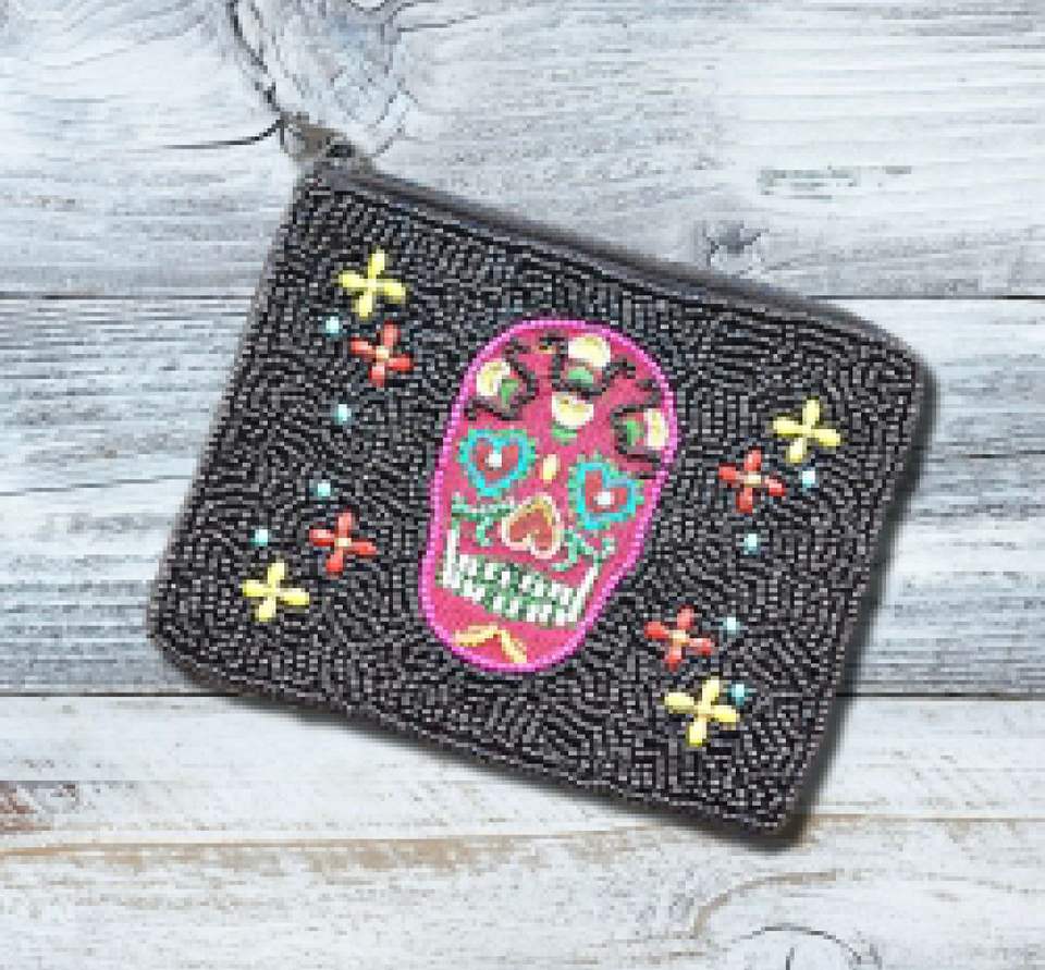 Top Selling Unique Sugar Skull Design Mini Coin Purse Handcrafted Day of the Dead Seed Bead Canvas Material with Zipper Closure