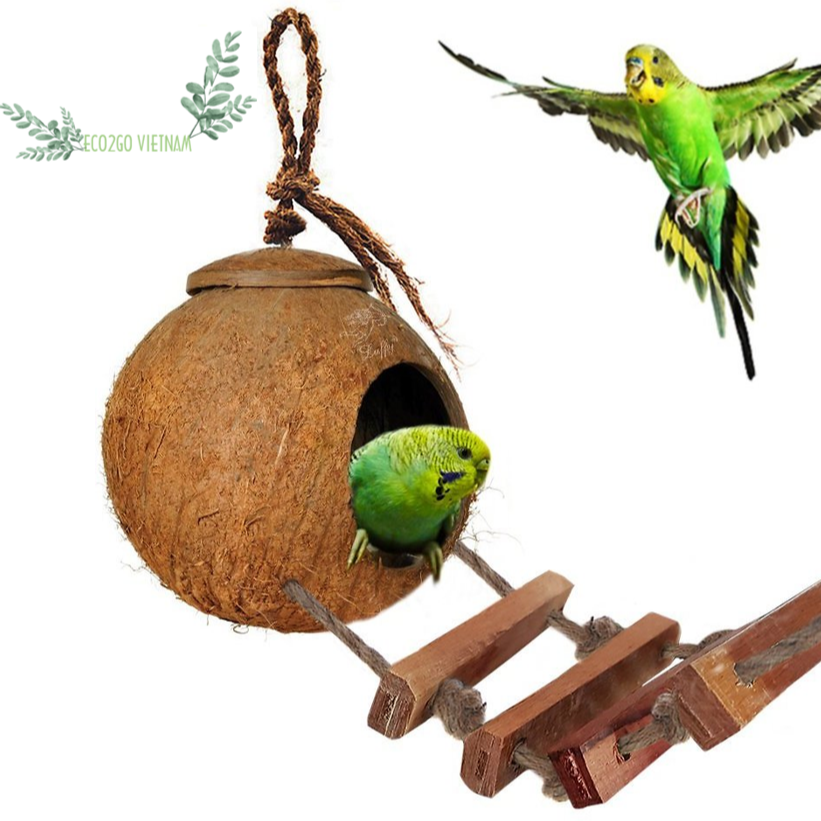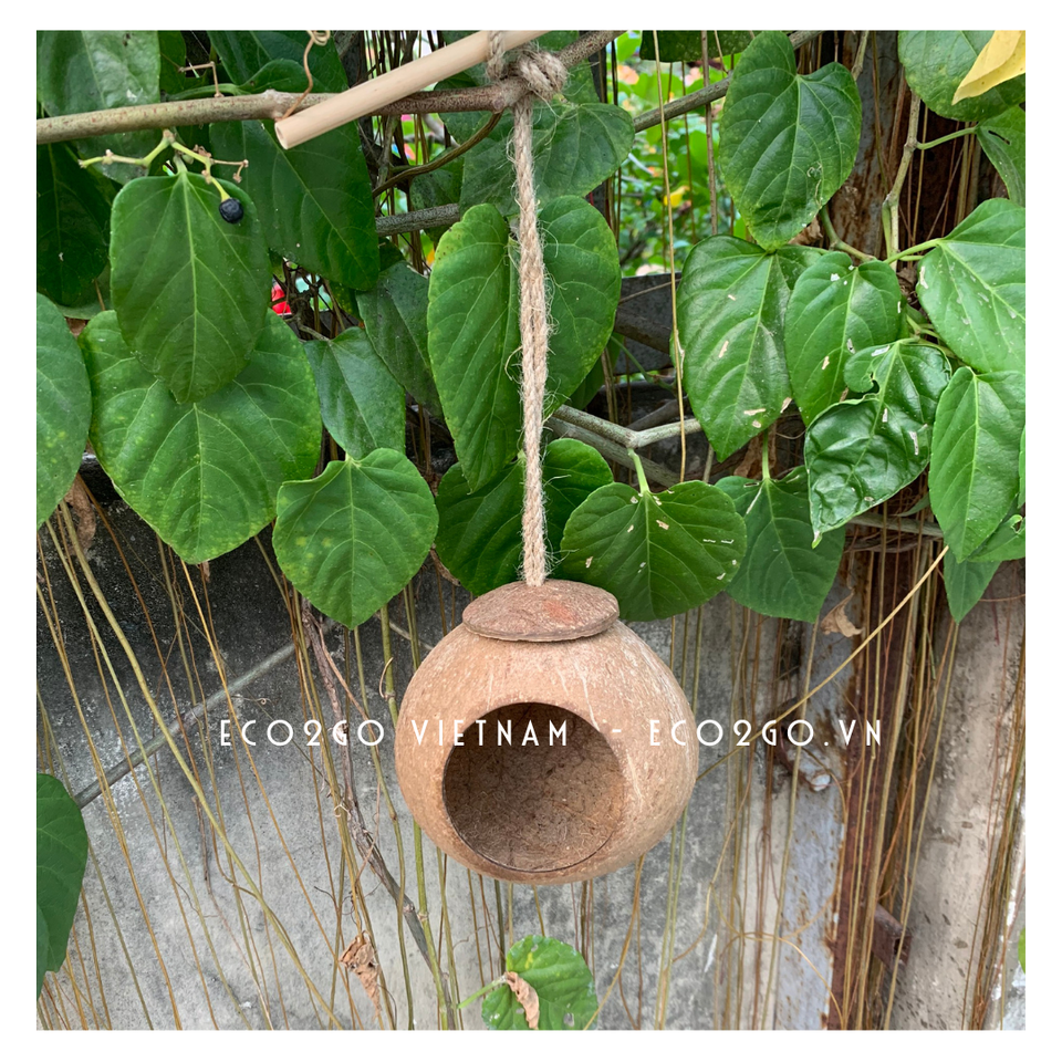 Top Selling and Trending 2025 Coconut Shell Bird House/ Coconut Bird Nest With Engrave Laser Logo Made by Eco2go Vietnam