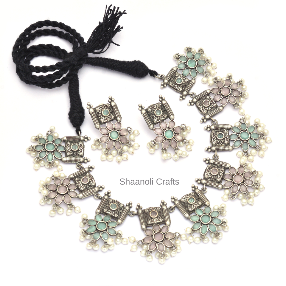 Top Stylish Unique Indo-Western Choker Necklace Set in Oxidized Silver Indian Part-Wear Jewelry