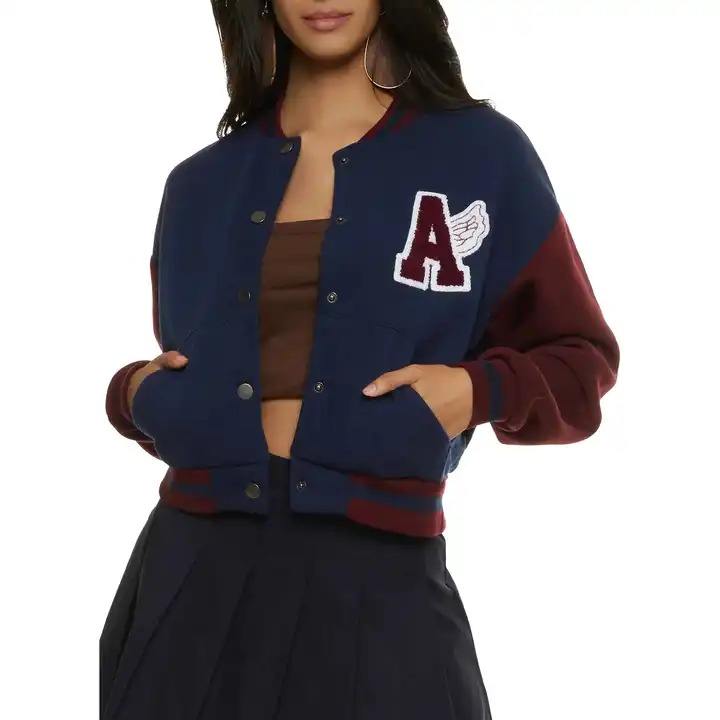 2025 Top Trending Women's 100% Cotton Fleece Varsity Jackets Custom Logo Cropped University Embroidery Women's Jackets