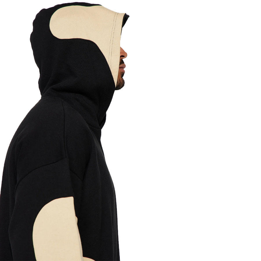 Top Trending Men Black Heavyweight Pullover Hoodie With Beige Applique Patches And Kangaroo Pocket For Sale