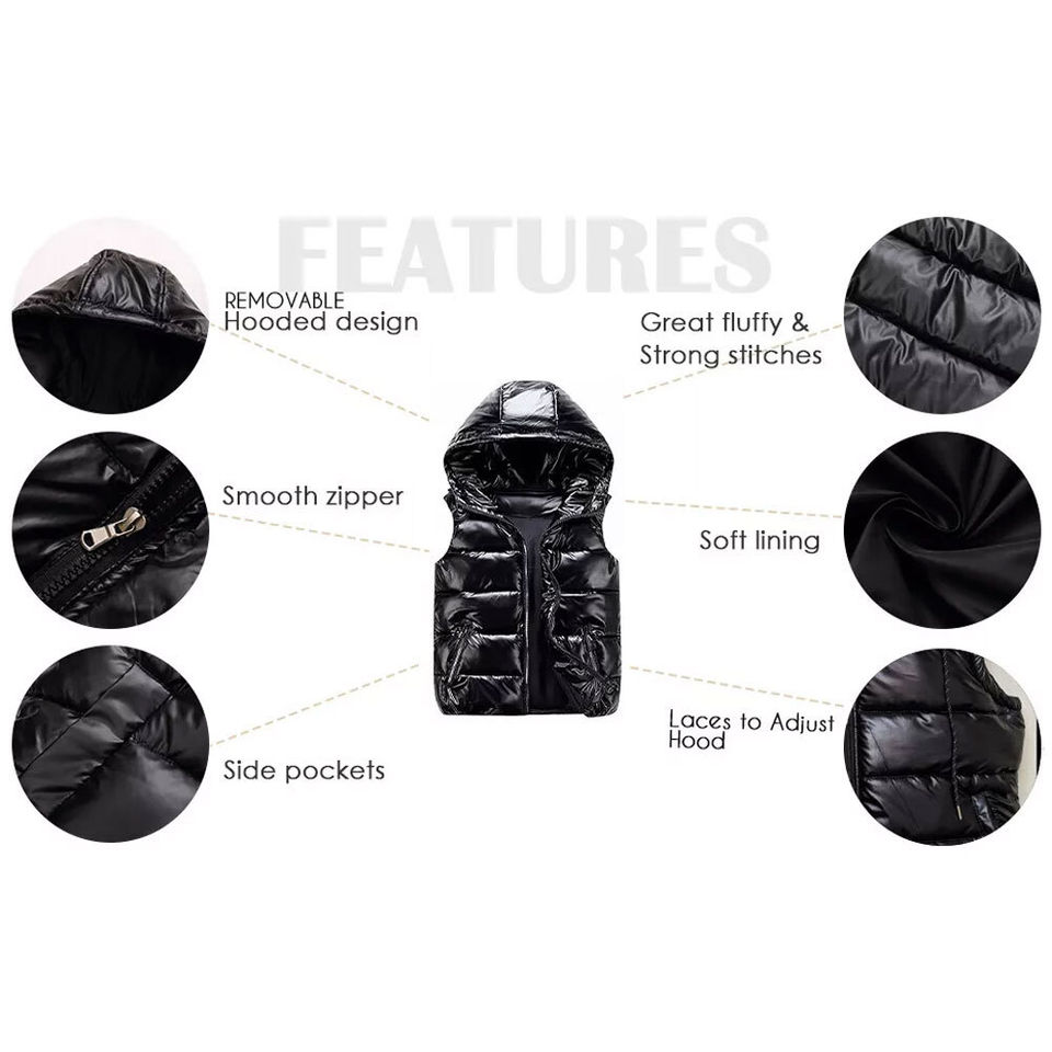 Top Winter Fashion Nylon Shiny Bubble Puffer Sleeveless Detachable Hooded OEM Zipper Thick & Warm Padded Sports Gilet & Jackets