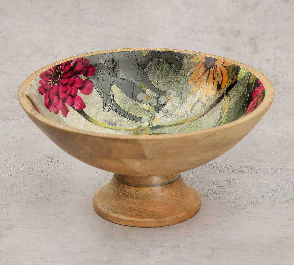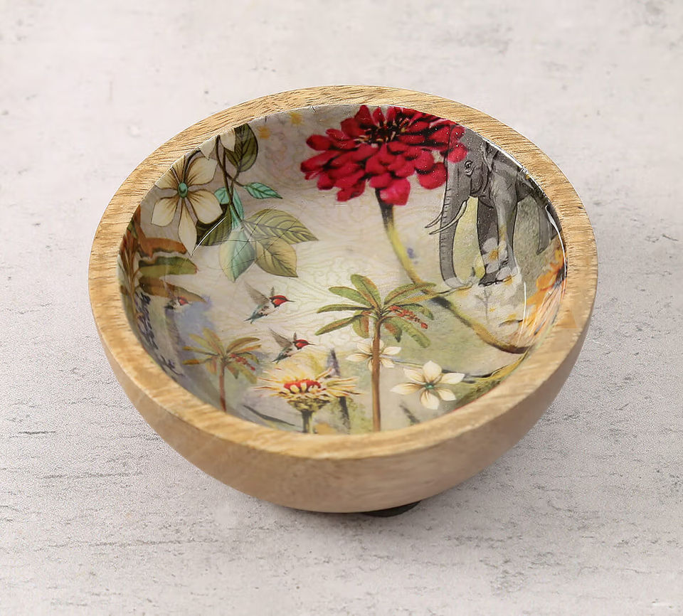 Top Selling Wooden Enamel Serving Bowl Colorful Leaf Pattern Snacks and Fruit Server with Wooden Base for Parties