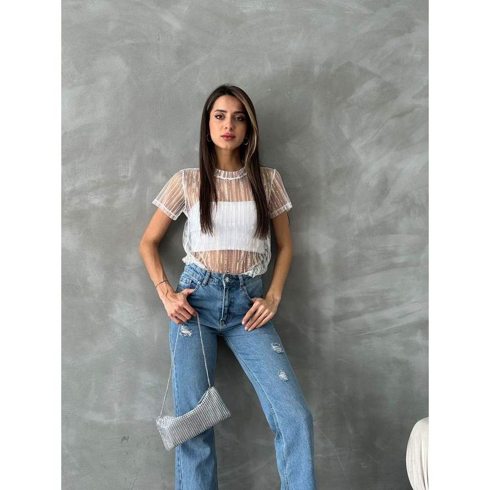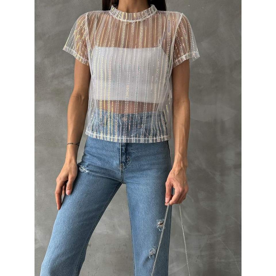 Topshow Cream Sequined Tulle T-shirts Wholesale Product with Sequin Fabric