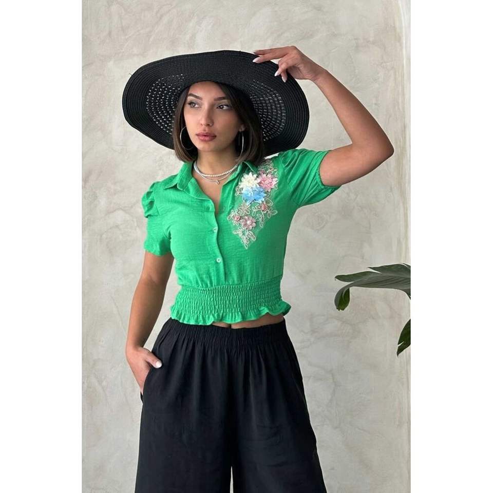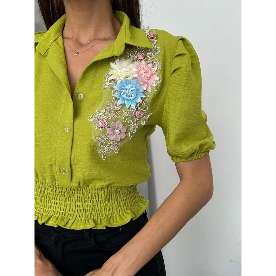 Topshow Wholesale Women's Pistachio Floral Linen Breast Shirts Elegant Floral Print Blouses