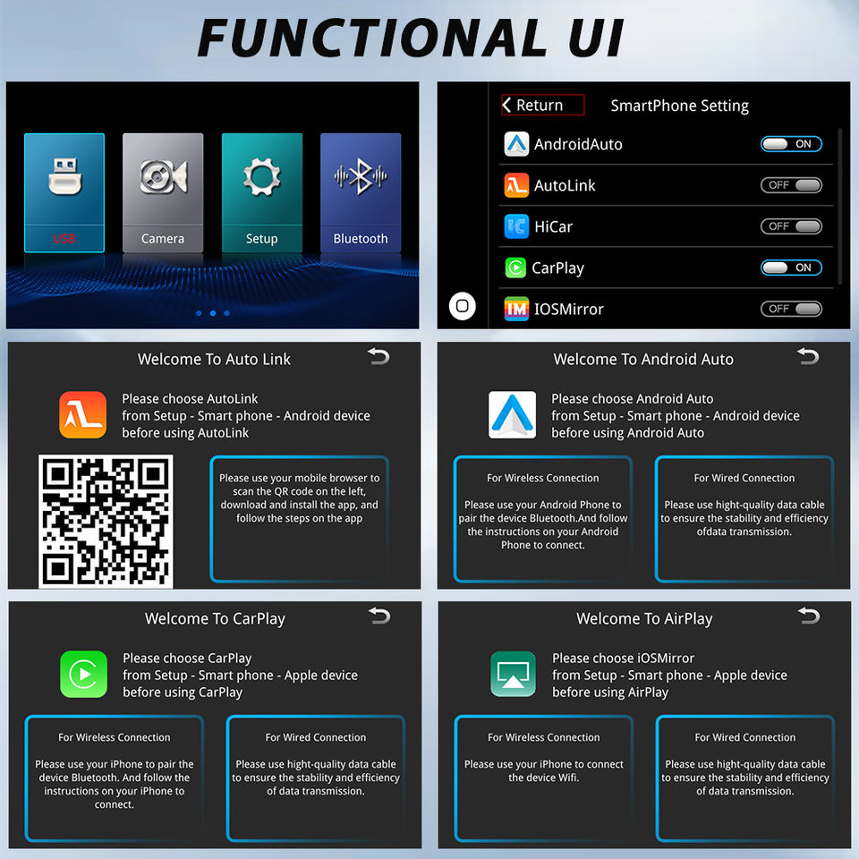 GPS, Stereo, HANDSFREE, DSP, CarPlay, Mirror Link, android auto, Split Screen, Car Steering Wheel ControlFunction