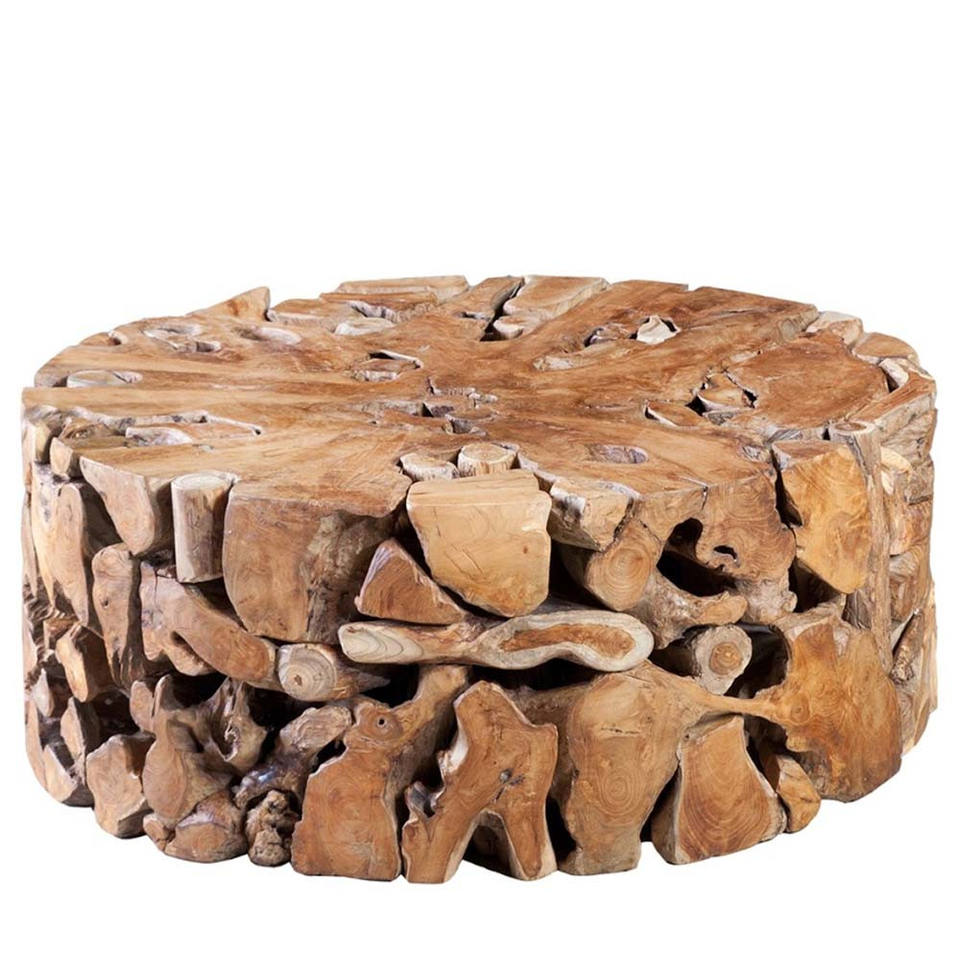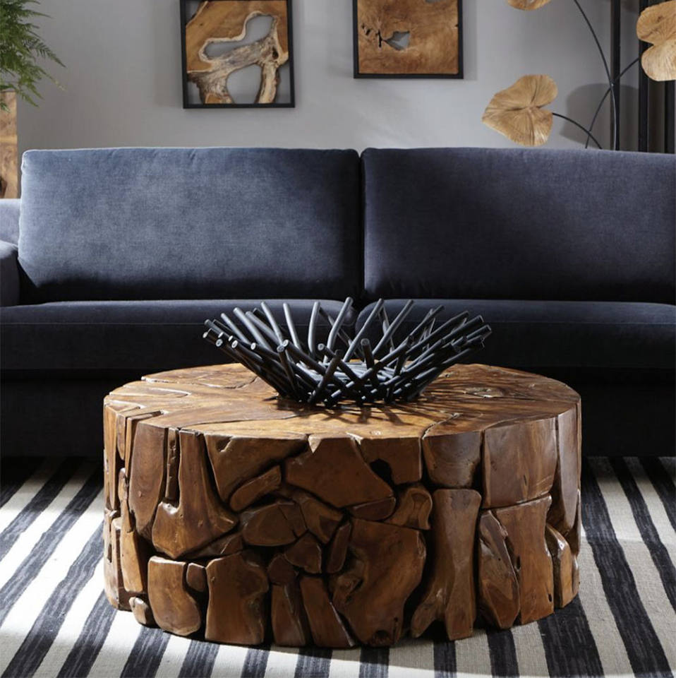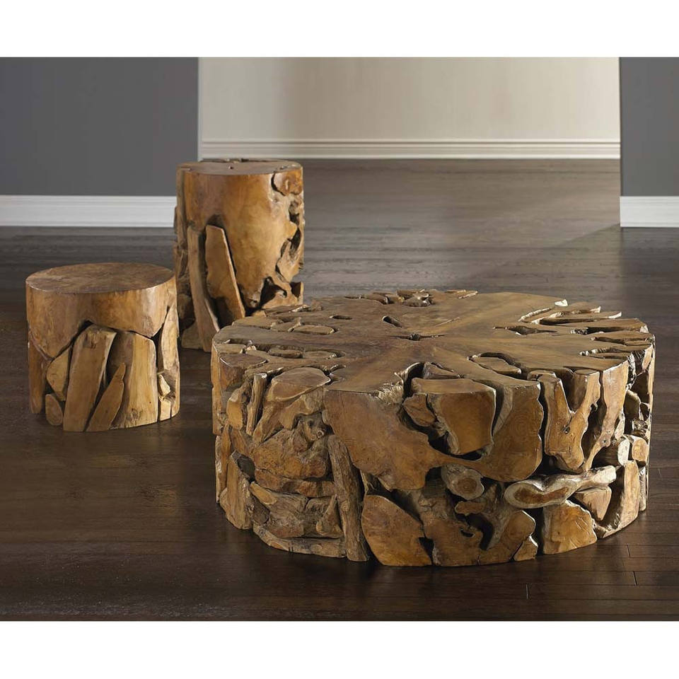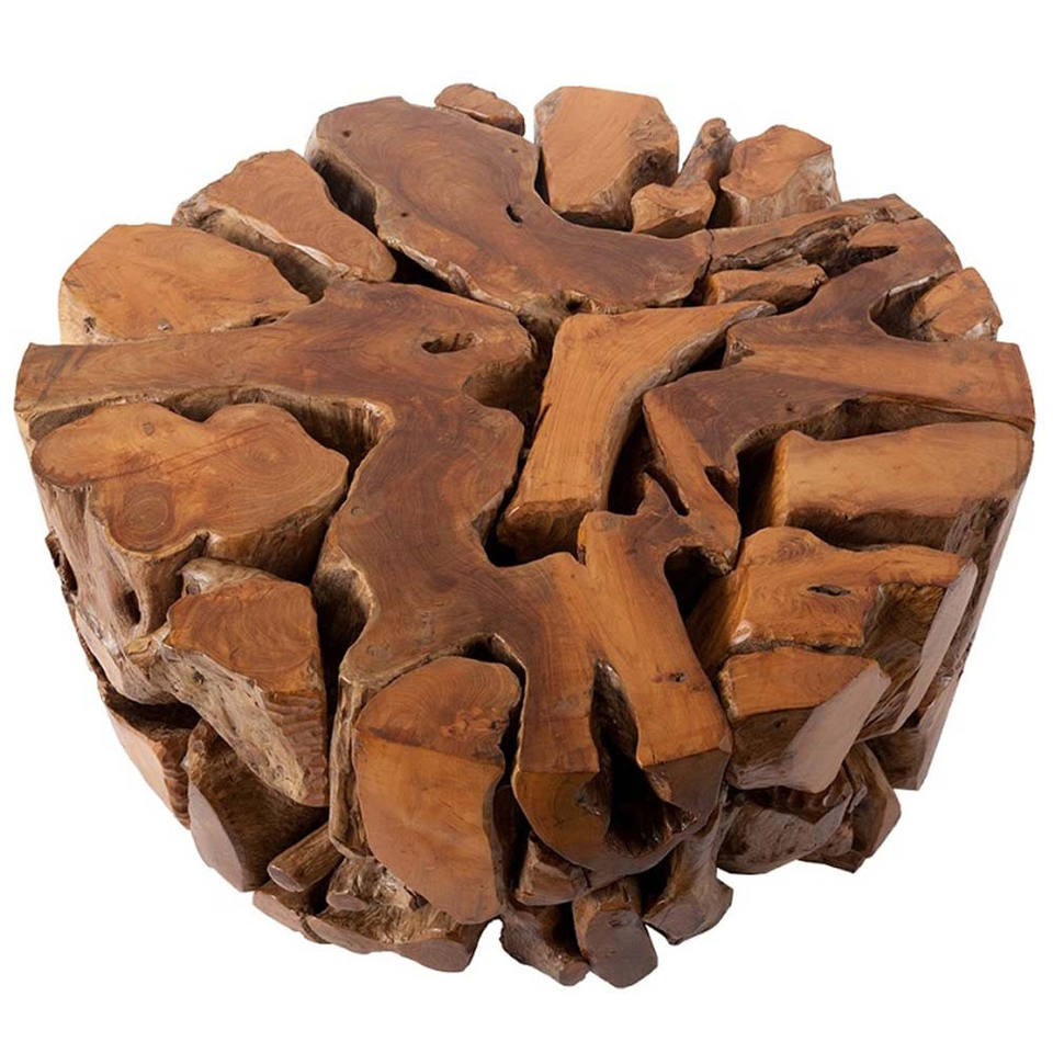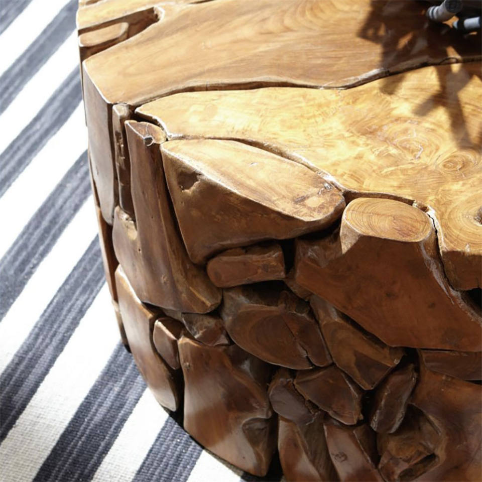Tovi teak cocktail table is made of solid teak wood made from leftover pieces hand assembled for outdoor use.