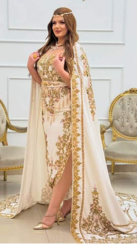 Traditional Algerian Designer White KARAROU DRESS with Trail with Embellished Glass Beads Pearls Dabka work on Crape Fabric=2025