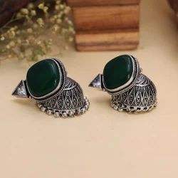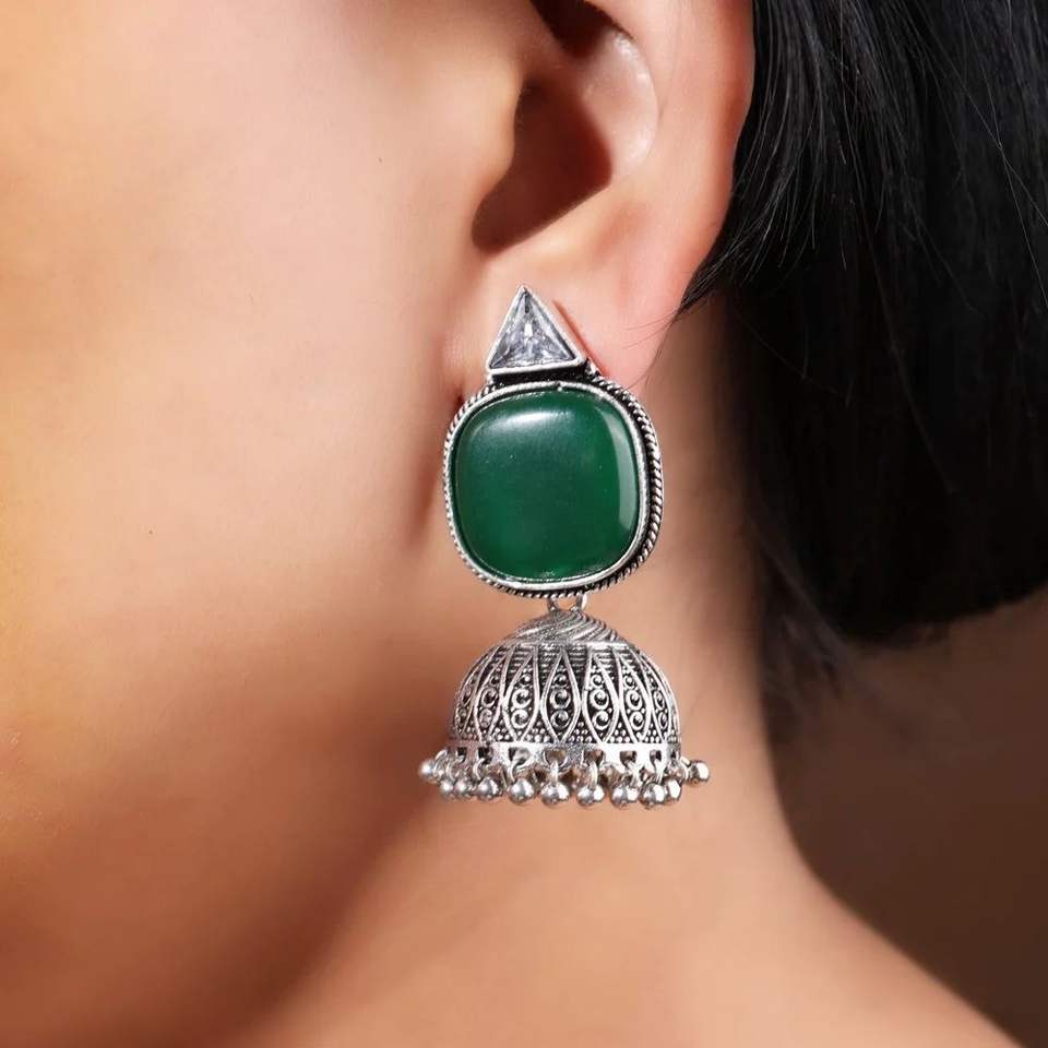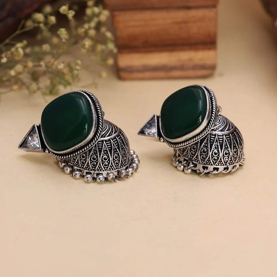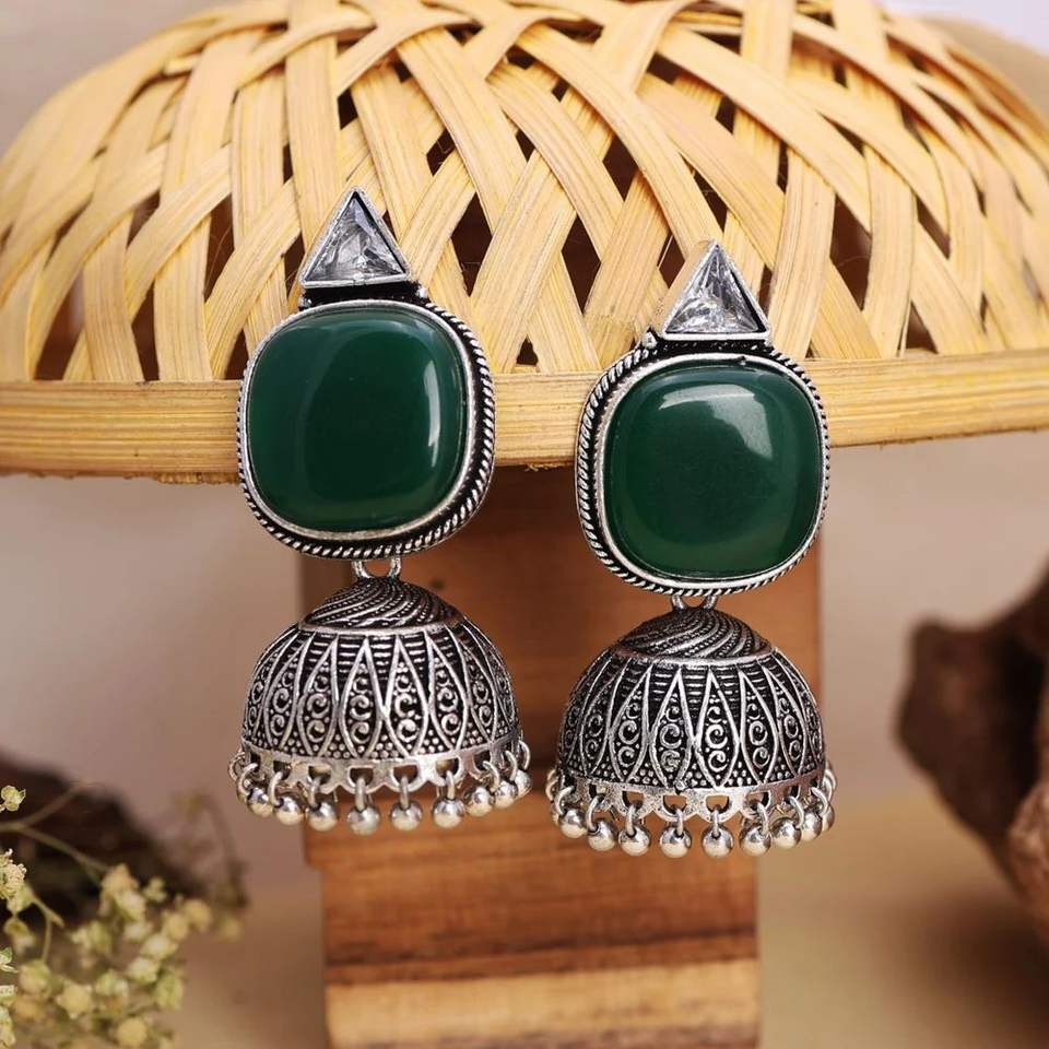 Antique Brass Oxidized Dangling Earrings Green Stone Jhumka indian Jewelry