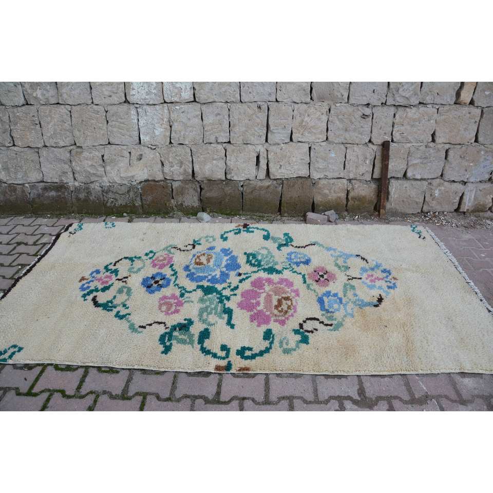 Traditional Beige Blue Vintage Turkish Rug 4.8 X 9.1ft Patchwork Pattern Wool Viscose Material 10mm Thickness Latex for Living