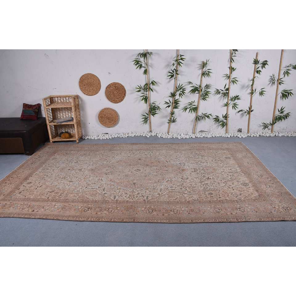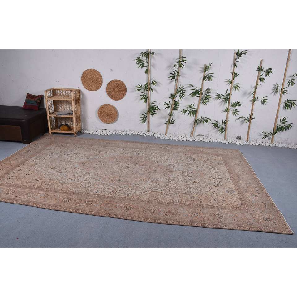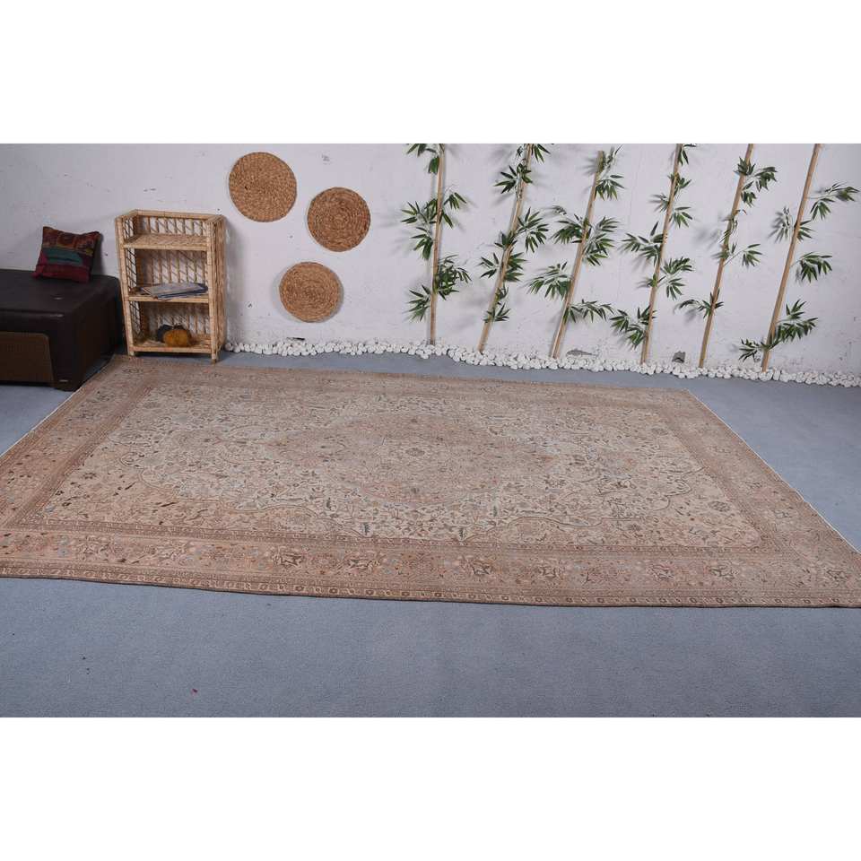 Traditional Beige Brown Wool Rug 6.6 X 11.3ft Vintage Turkish Patchwork Design for Living Rectangle Hallway Latex Bedside Rugs