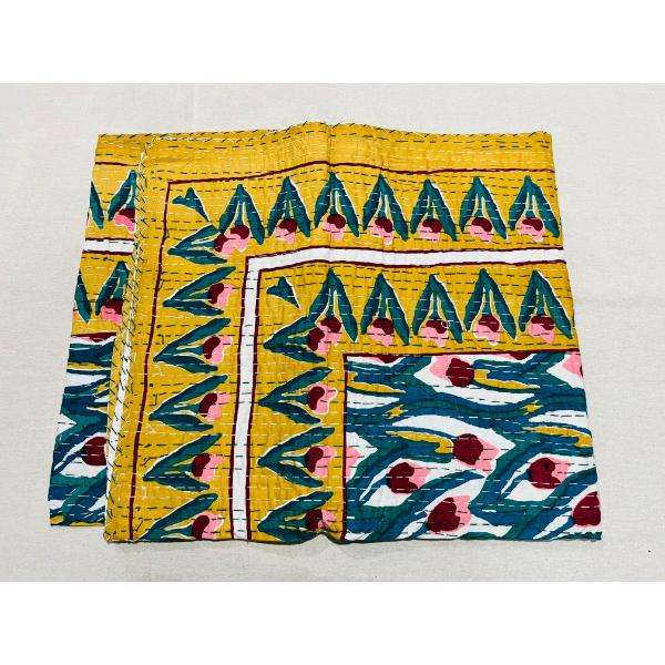Traditional Cotton Kantha Quilt Bedspread With Hand Block Printing And Detailed Stitching Offering Warmth Comfort And Artistic