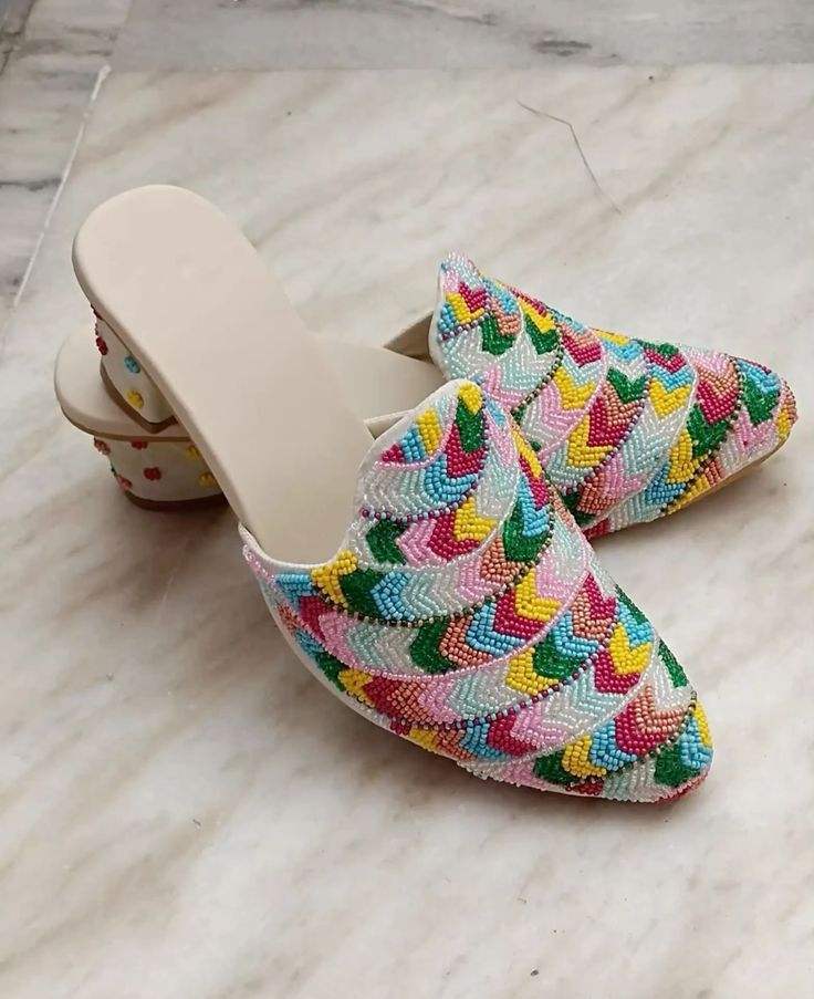 Traditional Cream Handcrafted Mule Heels Golden Floral Embroidery Pearl Detailing Stylish Wedding Party Pakistan Origin