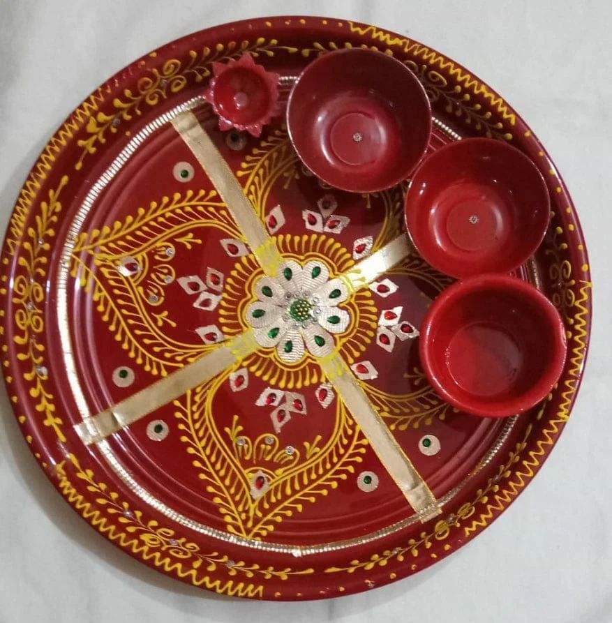 Traditional Decorative Stainless Steel Hand Painted Pooja Aarti Diya Haldi Kumkum Holder for Rakhi and Diwali Rituals