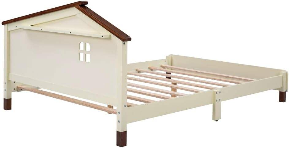 Traditional Design Solid Wood Platform Bed with House-Shaped Headboard in White and Gray Cream Full-Size Bed