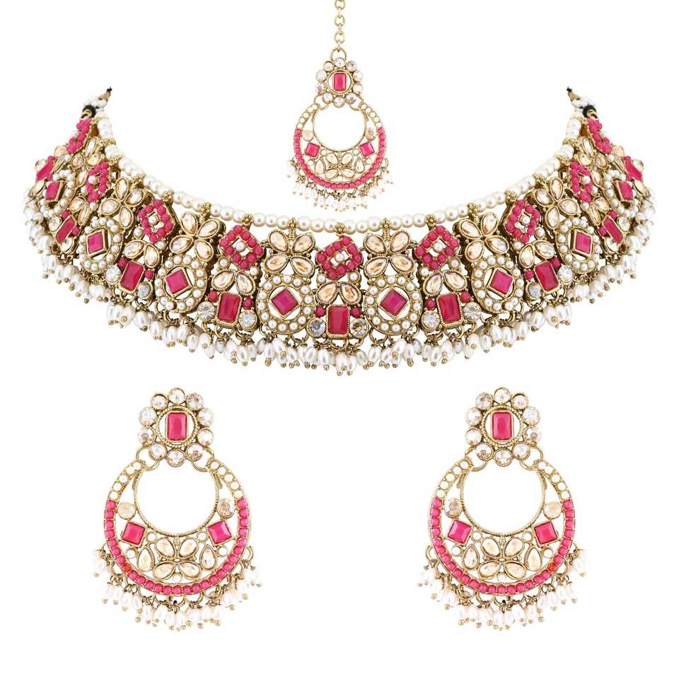 Traditional Floral Kundan & Pearl Choker Necklace Earrings Set Gold Plated Maang Tikka for Women Fine Jewelry K7304Q