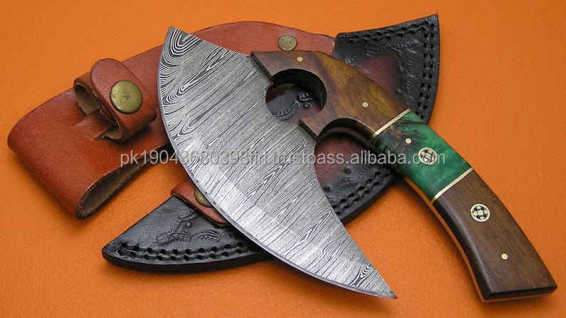 Traditional Full Tang Multi-Purpose Damascus Pizza Cutter Axe Utility Meat Chopping Knife with Wood Aluminium Leather Sheath