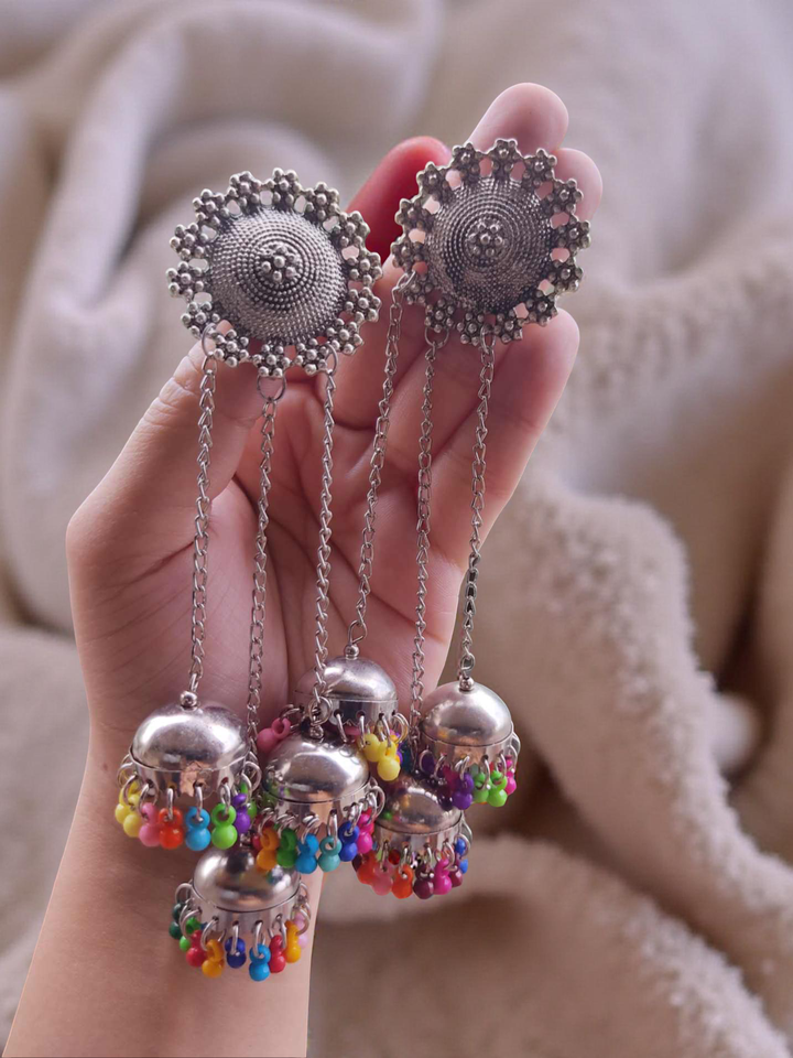 Traditional German Silver Floral Design Lightweight Bahubali Stud With Long Chain Multi Bead Jhumki Earring For Women And Girls