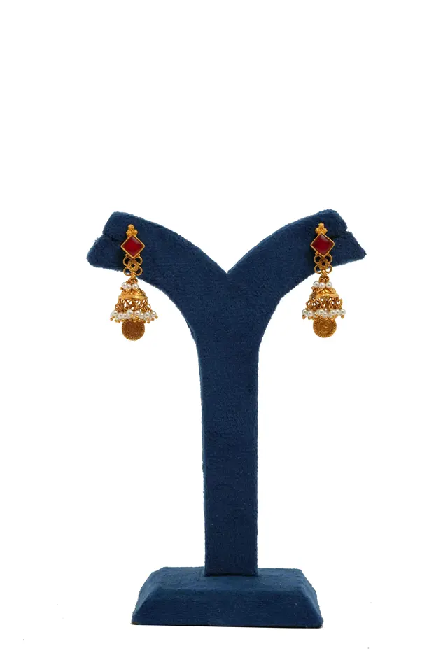 Traditional Gold Necklace Set with Coin Charms Pearl Drops and Red Green Stone Earrings Bridal Indian Jewelry