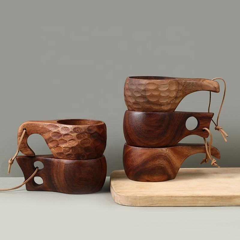 Traditional Handcrafted Nordic Design Wood Cup with Leather Lanyard Hardwood Camp Mug for Camping Natural Packaged in Opp Bag