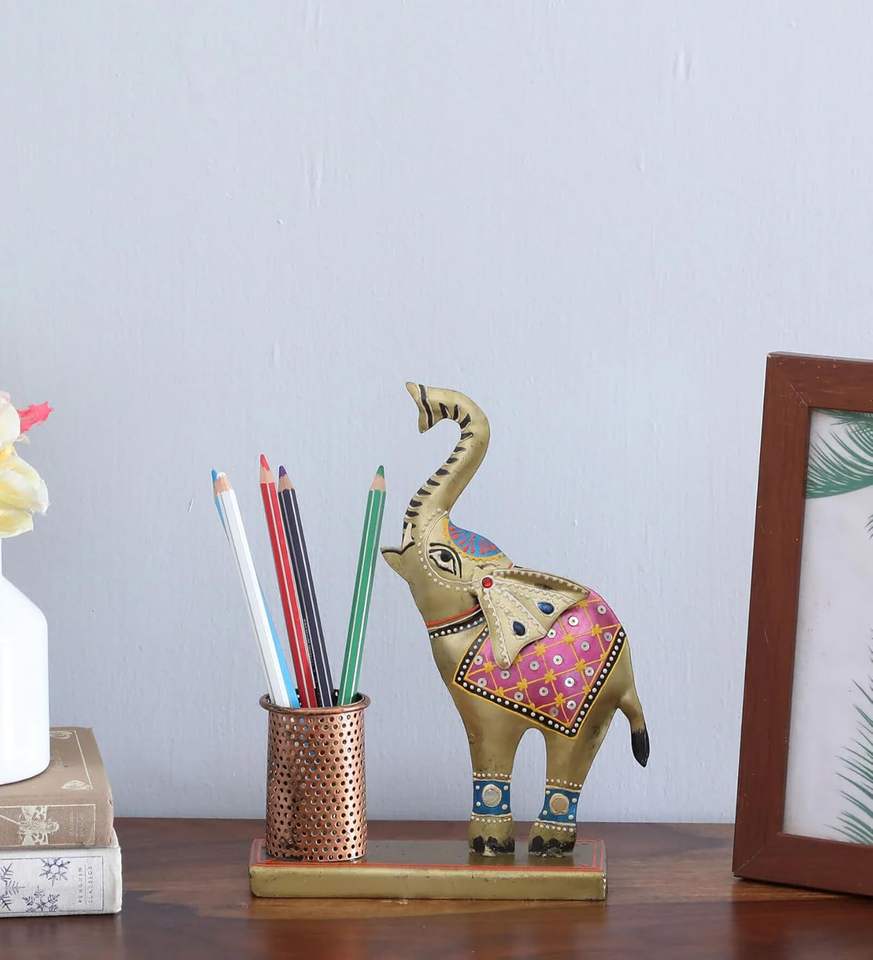 Traditional India Metal Baby Elephant Pen Stand for Home Office Study Use to Hold Pens Pencils Notes Cards and Desk Accessories