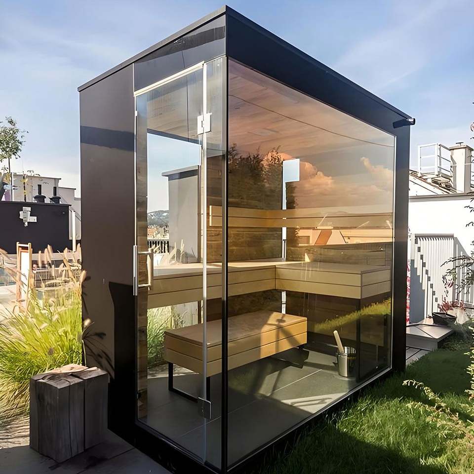 Traditional Outdoor Steam Sauna Room - Custom Luxury Panoramic Glass Solid Wood, Prefabricated with Rest Area & Spa