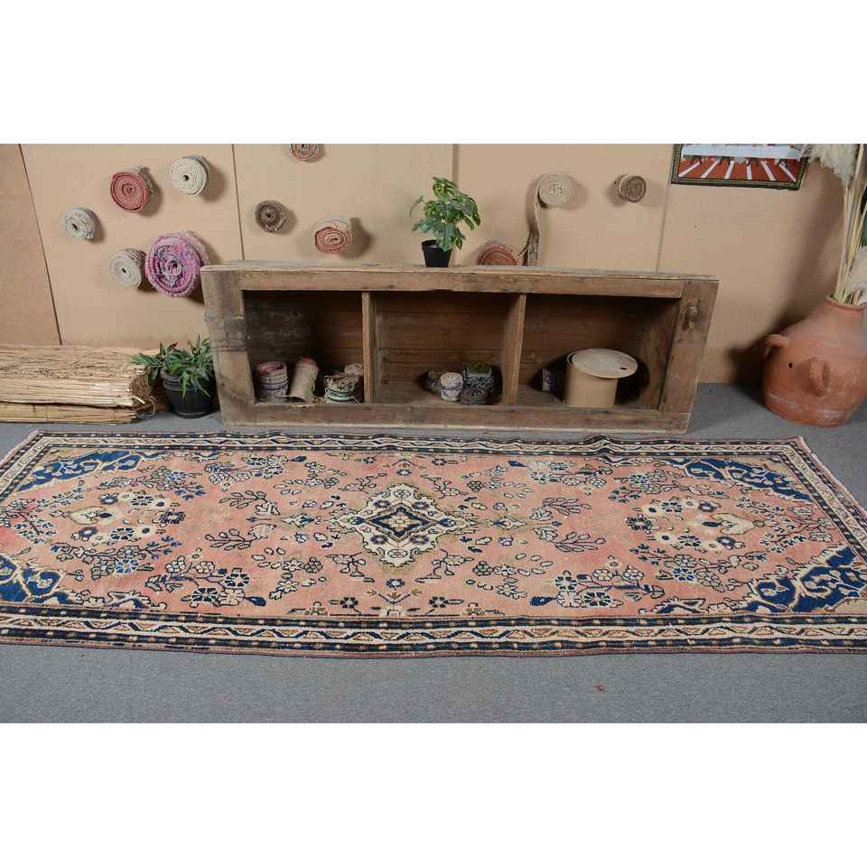 Traditional Pink Blue Wool Rug 3.5 X 10ft Vintage Turkish Large Area Rectangle Patchwork Abstract Latex for Hallway Use Room Rug