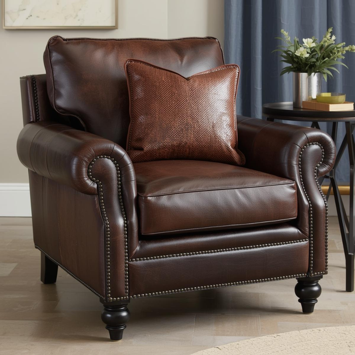Traditional Real Leather Arm Chair Upholstered Accent Sofa with Rolled Arms Nailhead Trim for Living Room and Office