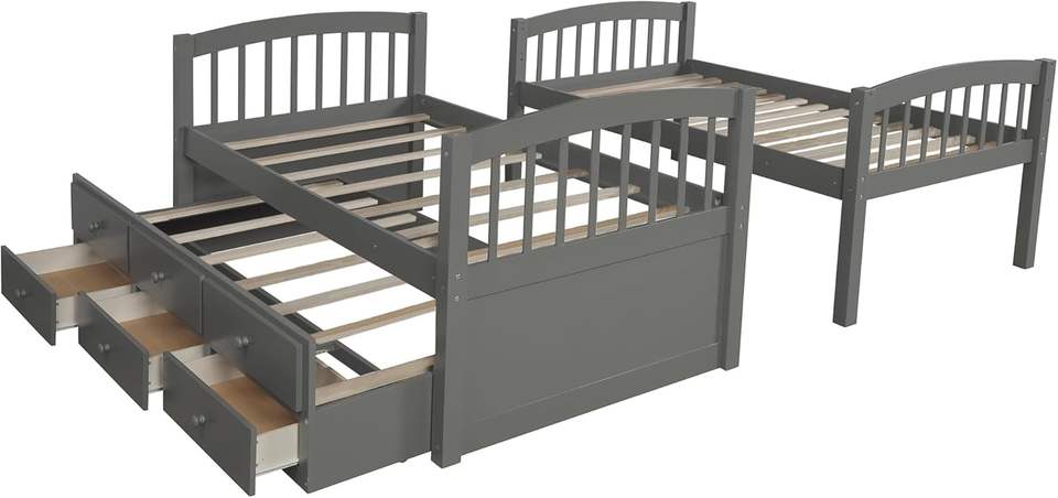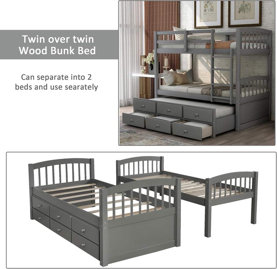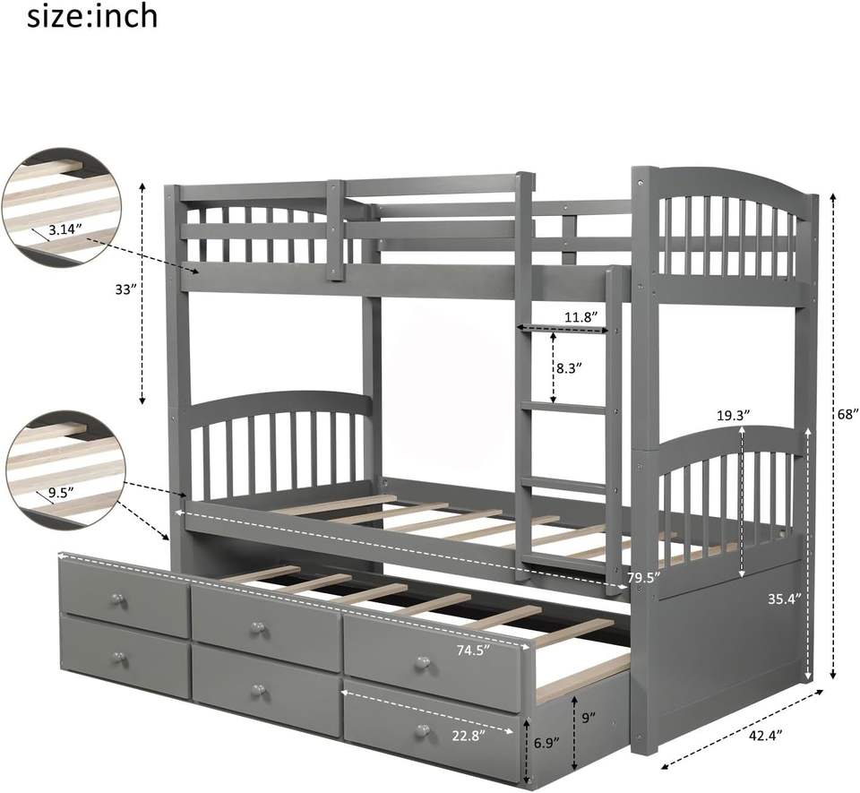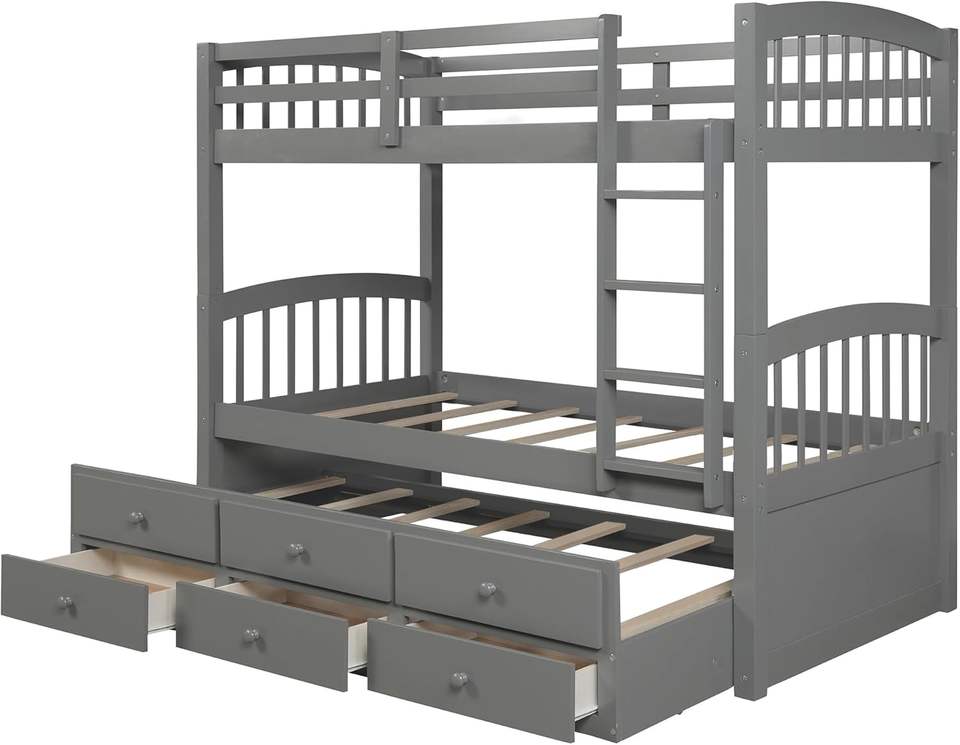Traditional Solid Wood Twin-Over-Twin Bunk Bed with Trundle & 3 Drawers Gray Includes Safety Rails for Kids' Guest Bedrooms