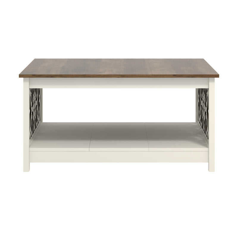 Traditional Square Wood Coffee Table with Intricate Carved Apron Panels and Movable Lower Shelf Storage for Heritage Interiors