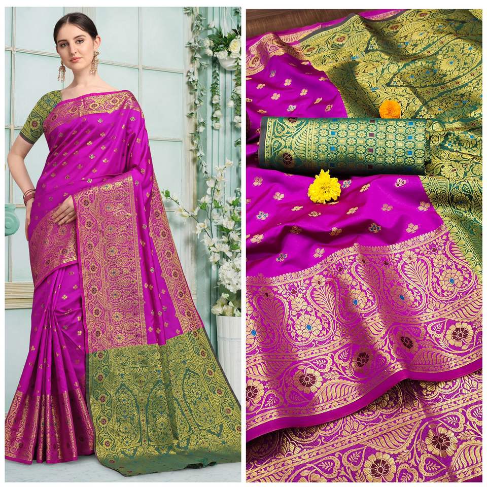 Traditional Trandy Heavy Rajwadi Pure Lichi Silk Saree With Beautiful Gold Zari Weaving and Contrast Matching Boulse