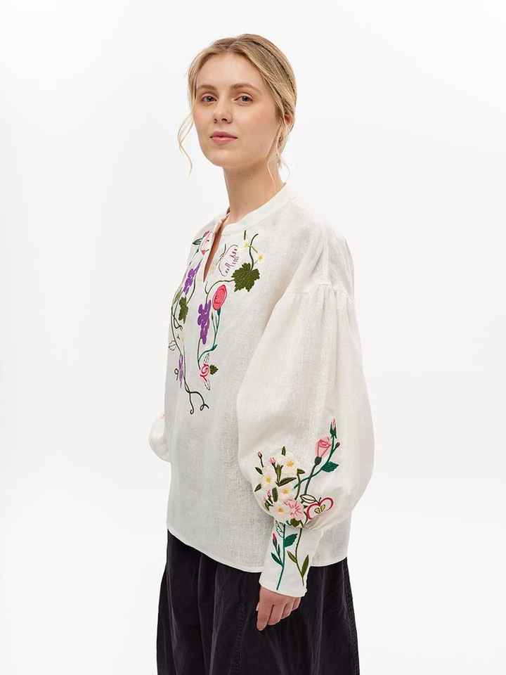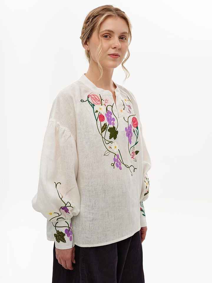 Traditional Women Top Ivory Linen Embroidered Blouse Roses Grapes Design Boho Folk Handmade Shirt Vyshyvanka Style Plain Dyed