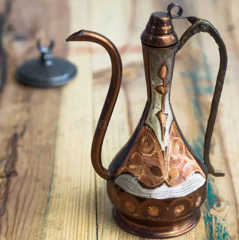 Traditional copper metal Dallah Arabic coffee pot, featuring a tall, elegant silhouette and ornate top Available at Wholesale