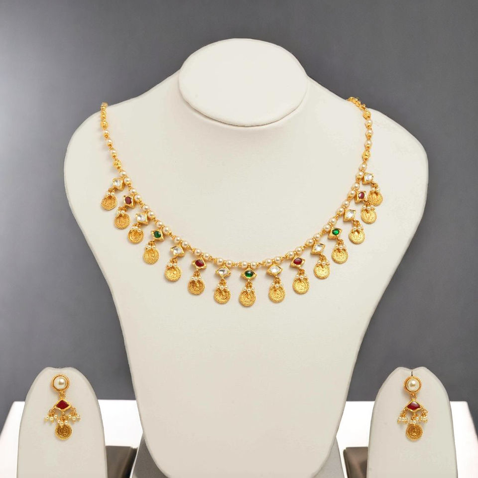 Traditional gold plated pearl chain necklace set with multicolor stone coin dangler design and matching earrings for festive