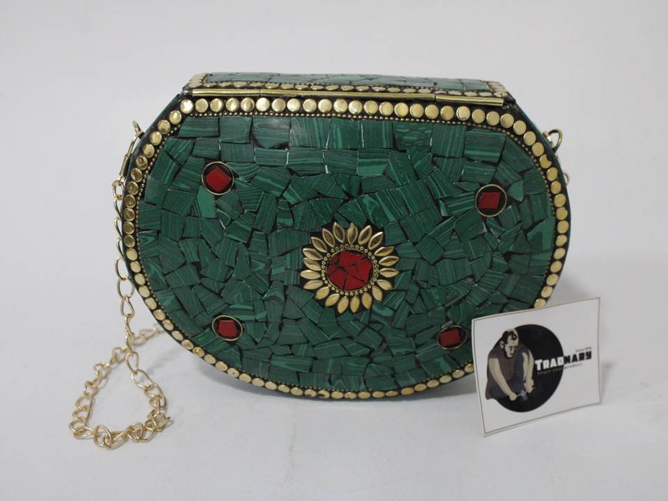 Tradnary Forest Green Mosaic Resin Ladies Clutch Bag Hook & Loop Closure Oval Shape Chain Decoration Wedding Handbag
