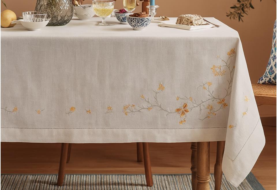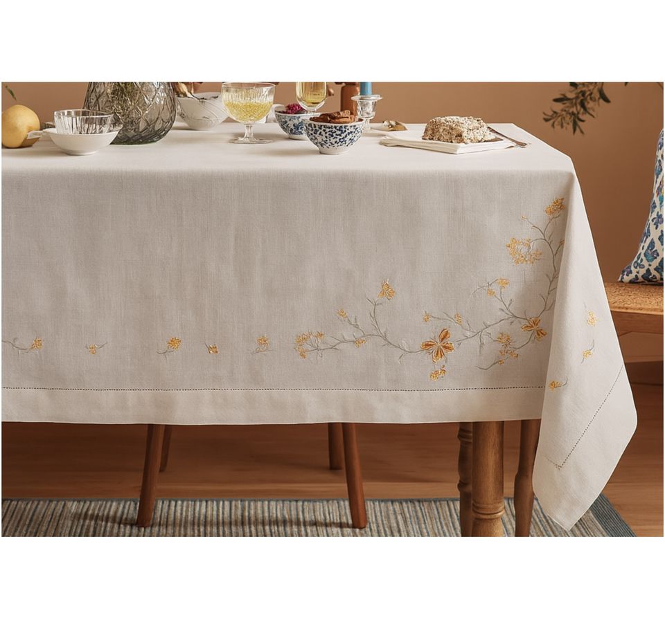 Trailing Vines & Butterflies Linen Tablecloth | Luxury 100% Linen Table Cover, Eco-Friendly Reusable, Floral Butterfly Design