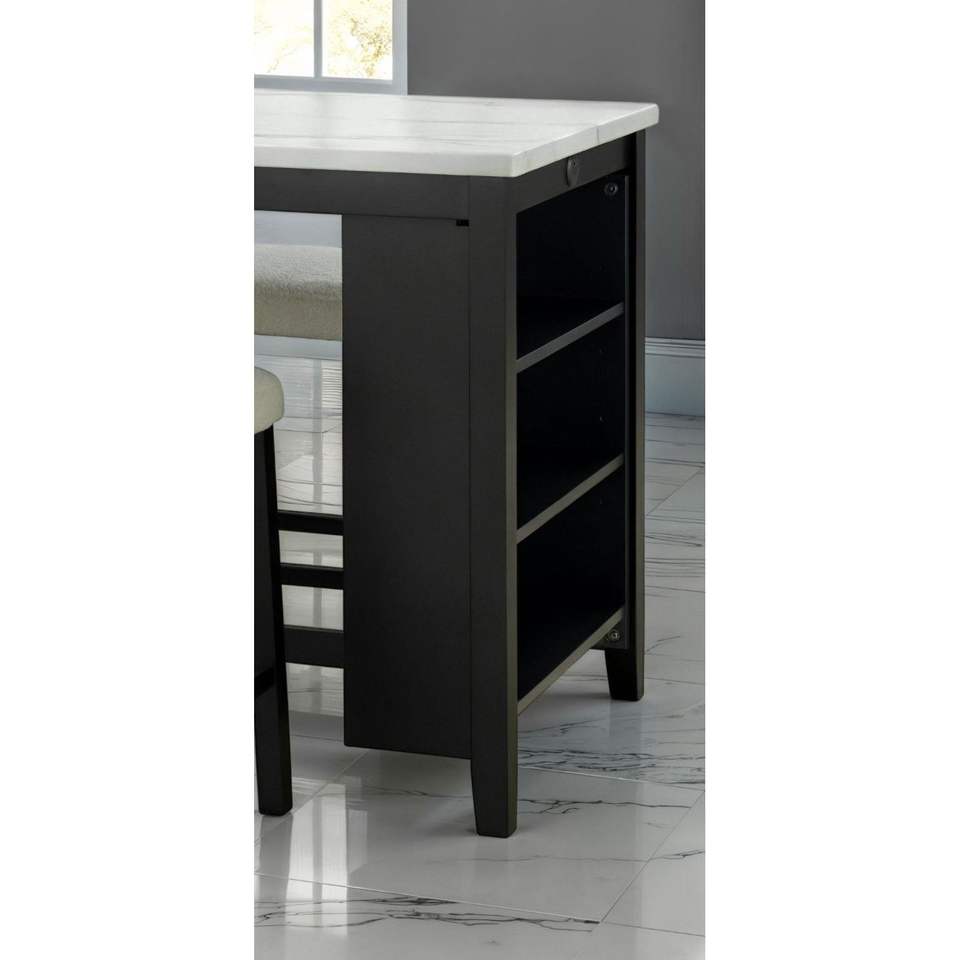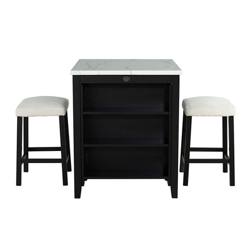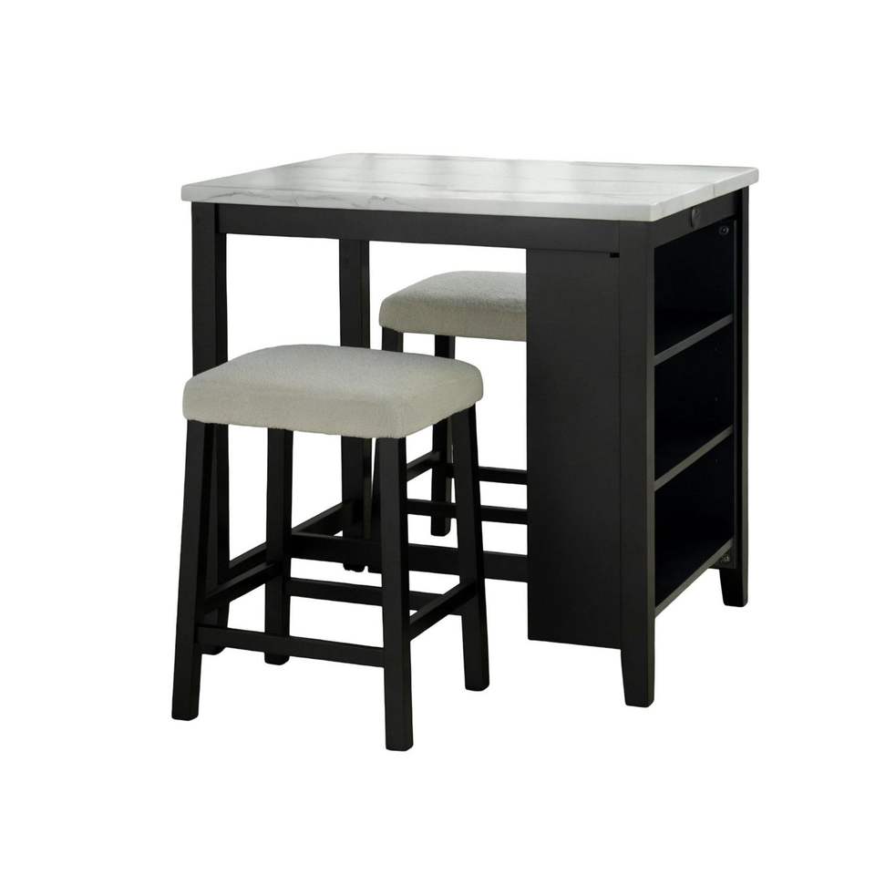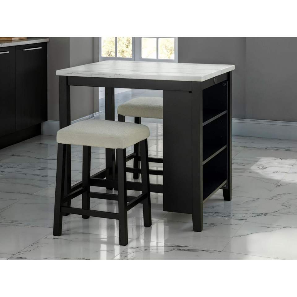 Transitional 3pc Dining Room Set Gloss Table Top with Storage Shelves 2 Side Stools in Black Ivory White